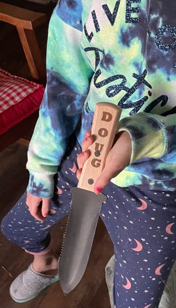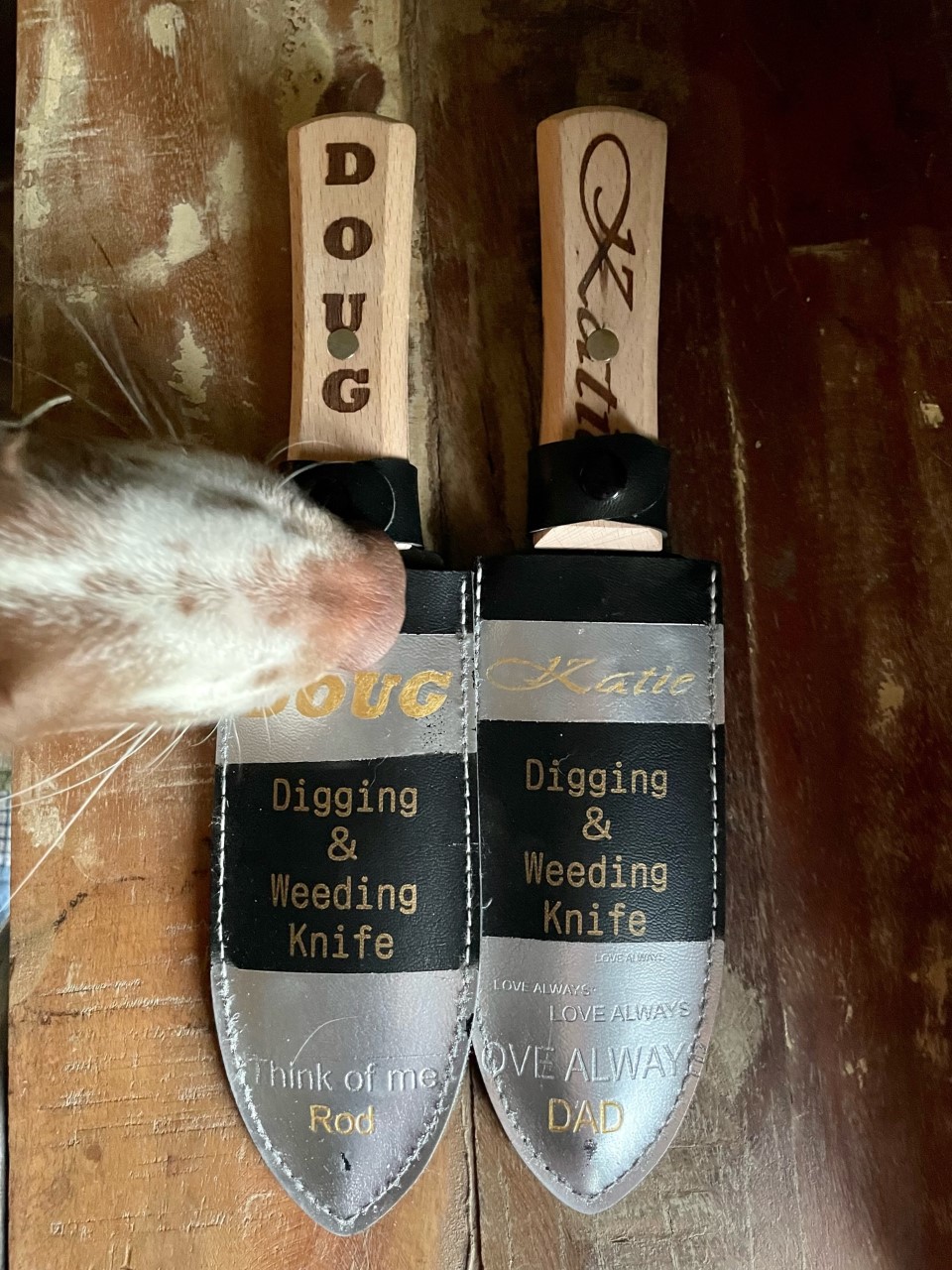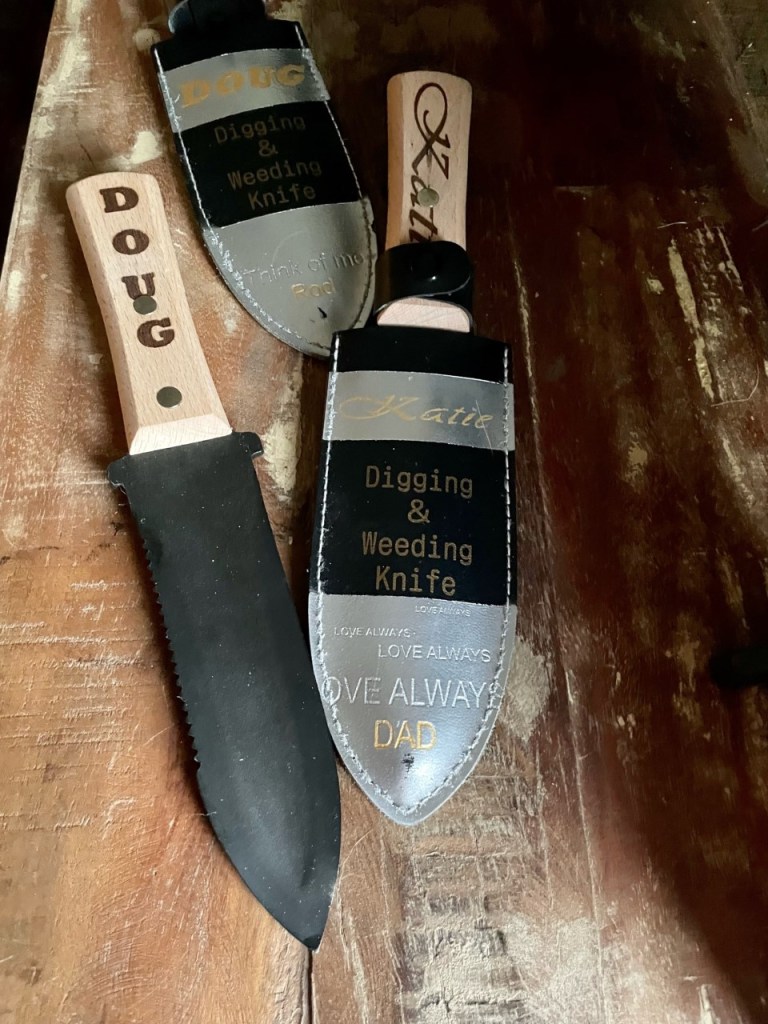 Our friend, Rod, bought me and Doug our own Hori Horis for Christmas. (Rod not realizing that Doug doesn’t usually help me with weeding and harvesting and may have inadvertently made him more useful in the garden! The garden is typically my domain.) Rod is an artist and engraved the sheaths with our names. The carriers fit on a belt loop. It makes me all the more excited to get back into the garden (after conveniently forgetting about flies, grasshoppers, and my archenemy, the squash bugs).