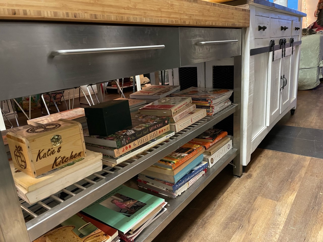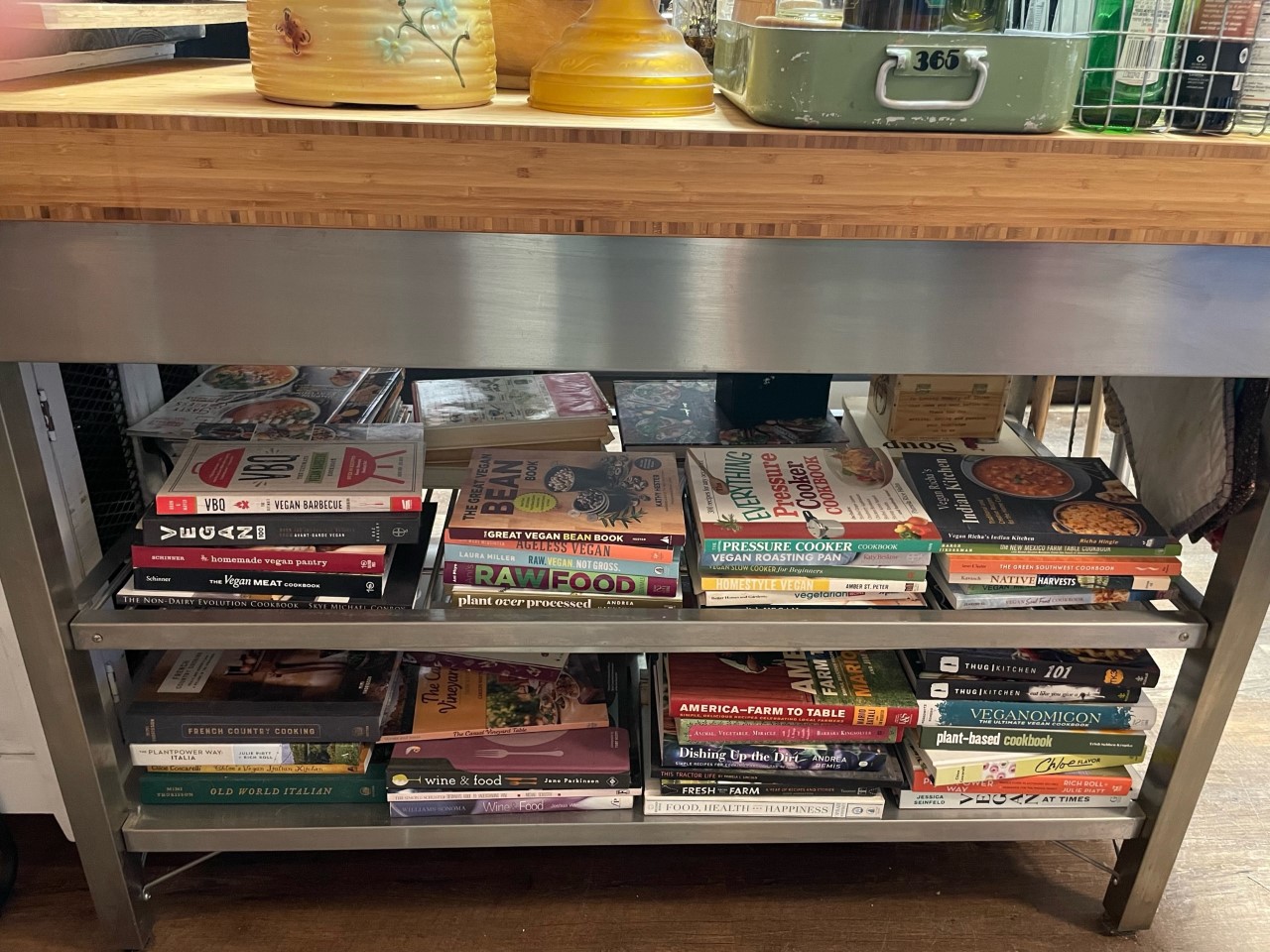I cleaned out all the drawers, discarded what I don’t use, or stored bigger counter appliances in the garage that aren’t used as much, and stacked all of my vast collection of cookbooks on the shelves of the island.