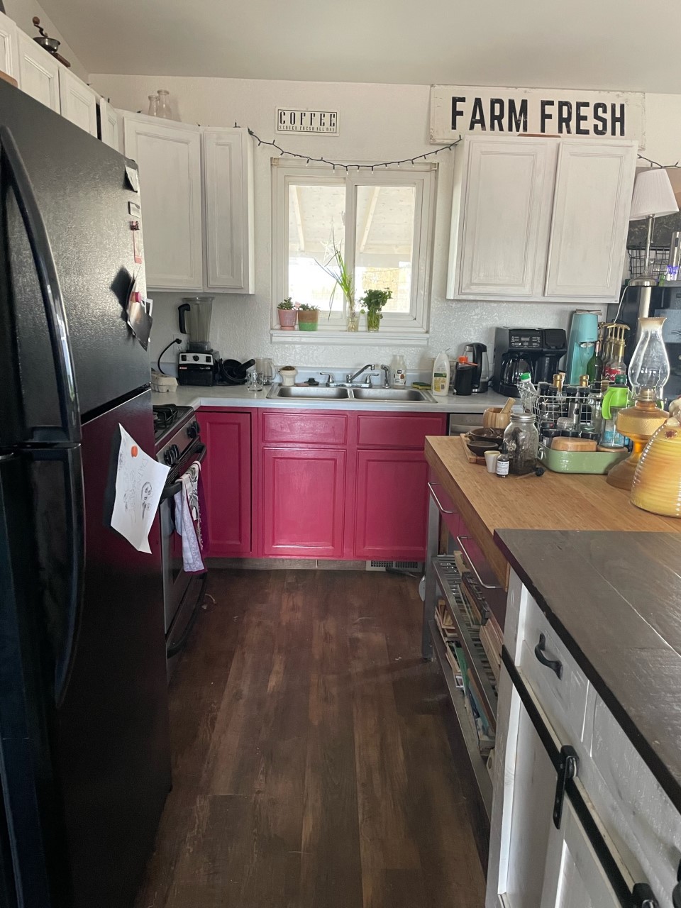 I am the self-proclaimed queen of using what I have, the power of paint, and the magic of rearranging furniture! I want a new kitchen. Who doesn’t? But new appliances, let alone a new house, are out of the question right now. How do I refresh? How do I change it up to make a space I love to cook in?