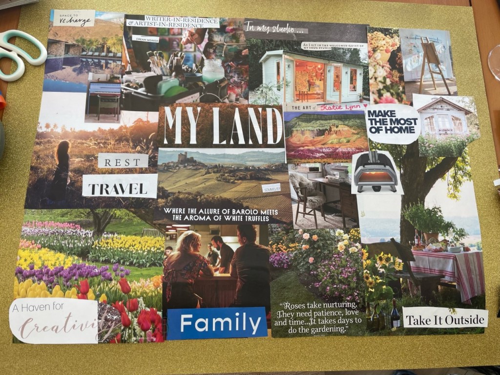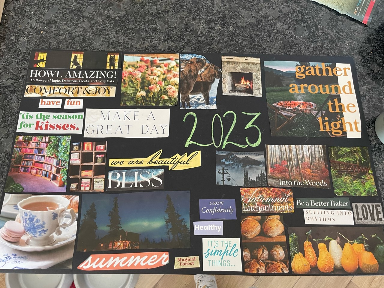 Vision boards are an amazing tool to lay out the year. We do not come with preconceived ideas, but rather talk and giggle and fan through magazines, pulling out pictures, cutting out words, and create a pile of whatever strikes us. Then we create the board with glue sticks and paste the pictures and words on. It is always amazing to see how they come together. What we really desire and need. It is as interesting to see what is not on the board. (No homesteading items on mine.)