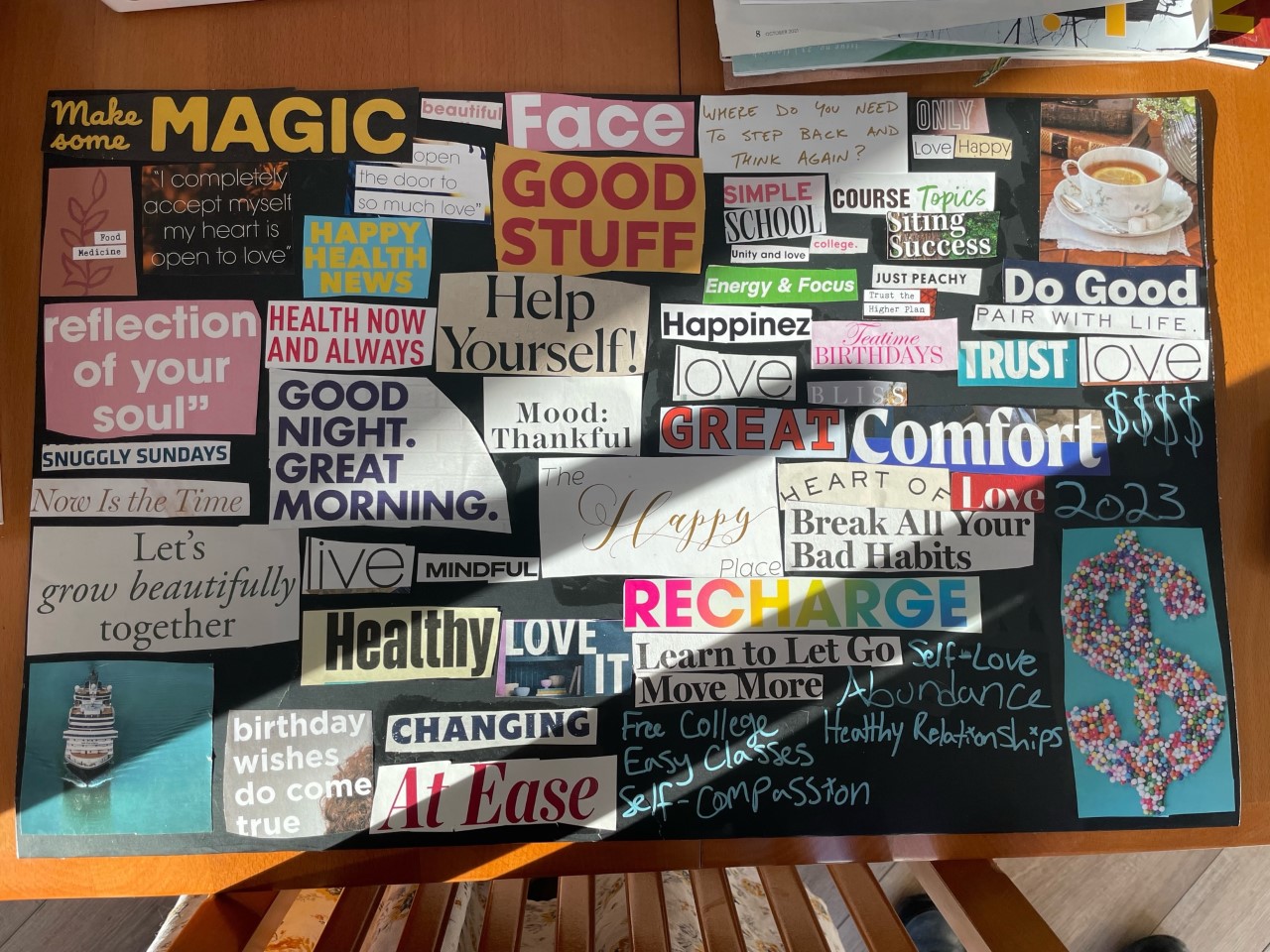 Everyone brings snacks, their own vision board, and extra art supplies if they want. Someone always brings a bottle of wine! There is always laughter, reminiscing on the year, noting what came true from last year’s boards, and candid banter between women. It is an event we all look forward to.