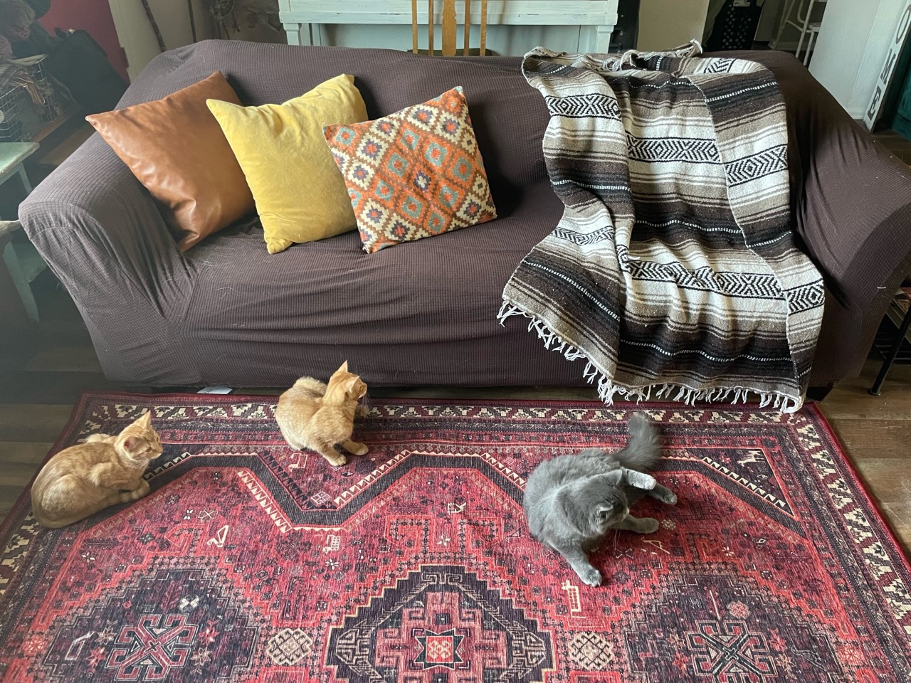 I wish that I were sponsored, but I am clearly not, as I am just a housewife like you all, but I think that makes my testimony all the better. I will never buy a regular rug again. Not ever. These rugs are affordable, especially once you have purchased the rug pad. The rug pad sits firmly on the ground, and sliding kittens, children, and furniture will not budge it. The rug sits on top snugly. It is easy to put down, easy to pull up, and mine go in the wash every week. I have paid too much for rugs that now sit in my garage because I have no way of cleaning them well. I live in an area with 60+ mile an hour winds, desert sand, and again, ten indoor animals, and a farm. Rugs don’t stand a chance. Since I am forever changing my decorating style, it is easy and inexpensive to get on the site and order another rug top(too easy, my husband would say).