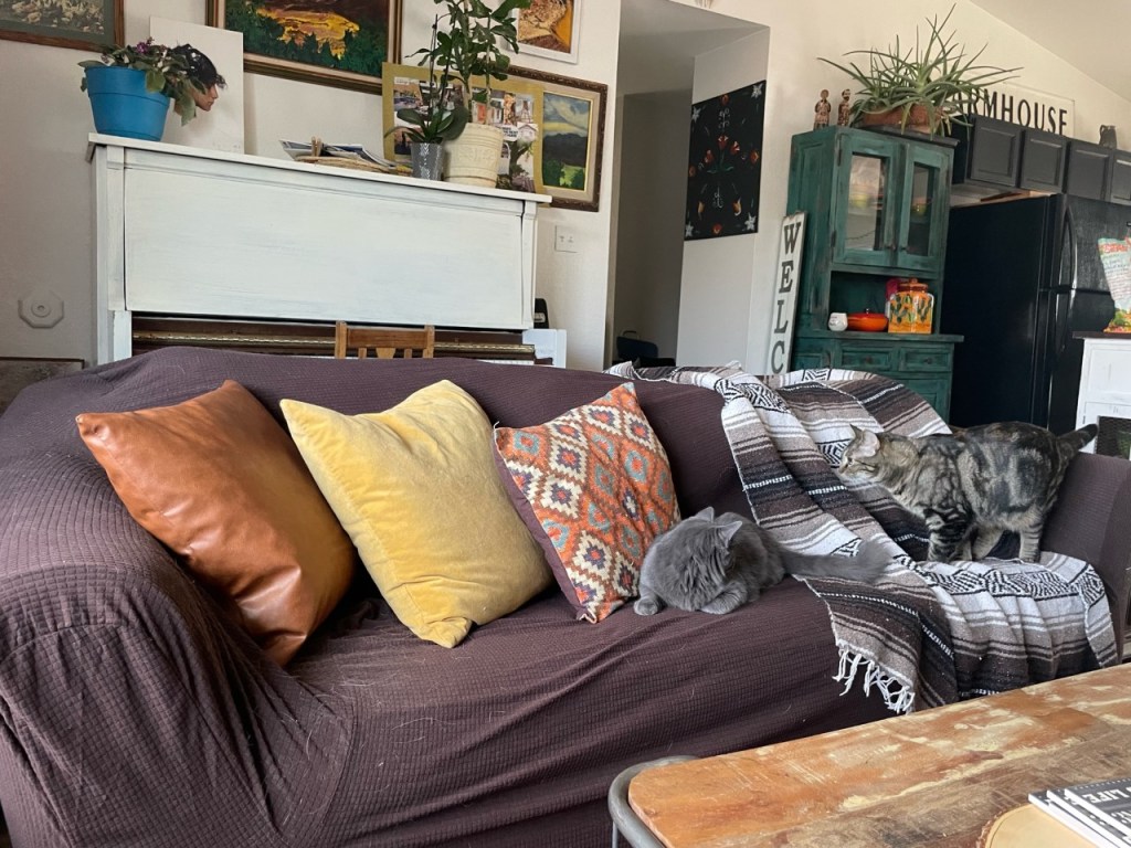 My sad new couch, which was poorly made overseas but seemed comfortable when we got it last spring, positively unravels at the slightest touch of cat’s claws. Add to that muddy dog paws, drips of coffee, and life, and we have ourselves an issue. Issue solved, get a sofa cover! I have a few of them and they take the brunt of the cats’ crazy time. My sofa is grey. I no longer love grey. The last sofa cover was mint green. Lovely, but no longer matches the renovation I have done in the past two weeks. Enter, the $38 Amazon special sofa cover. Wallah, brown couch. Throw it in the wash every week, get a different color, match it to your throw pillows and a simple blanket for a brand new sofa.