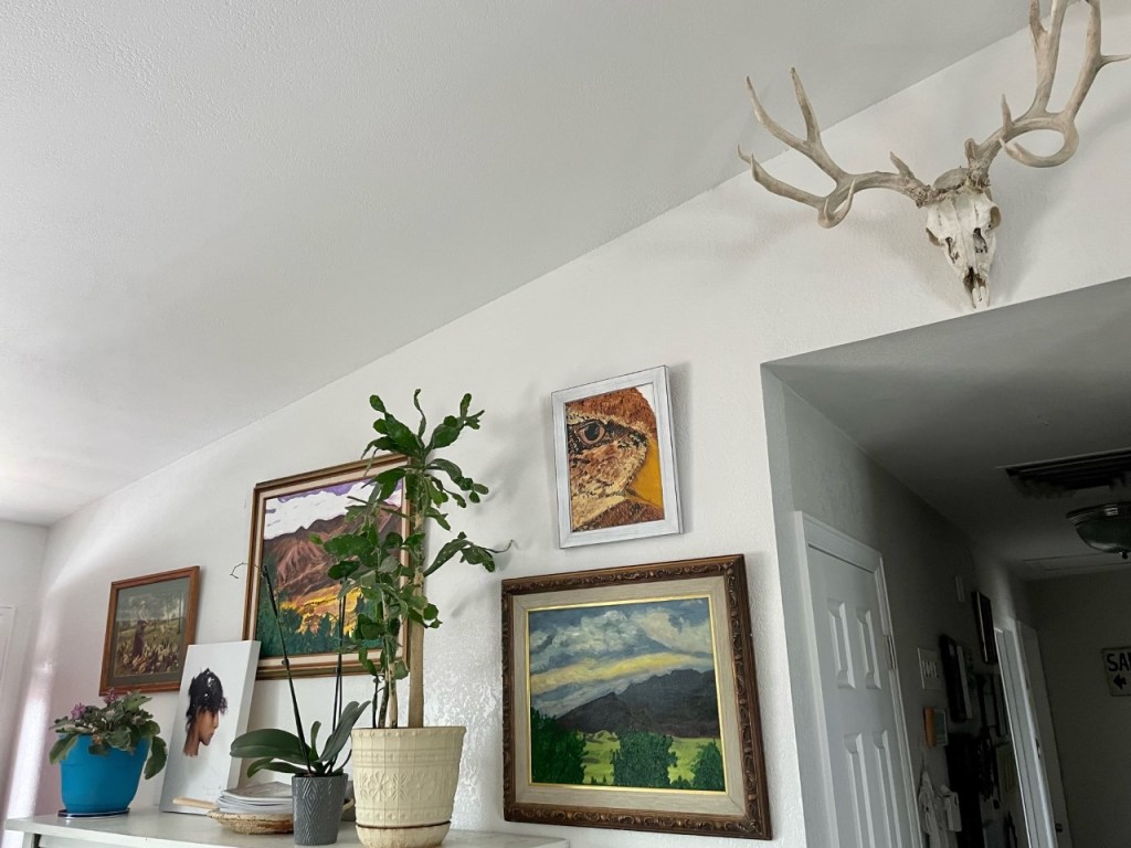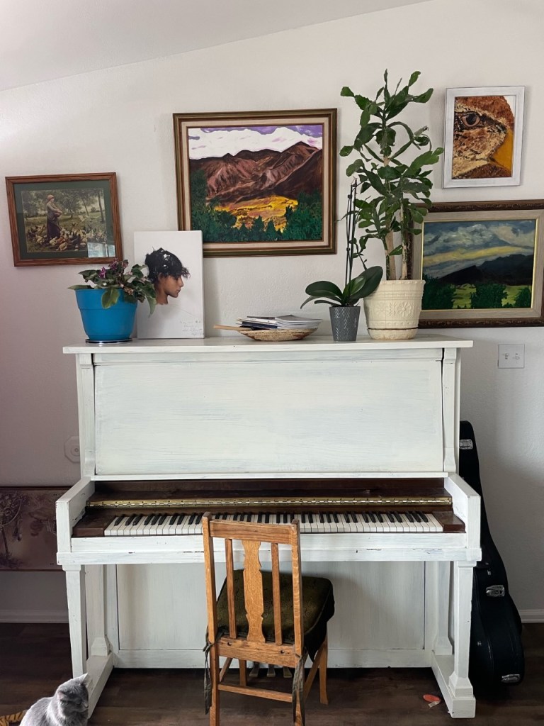 A wall of curated art or photographs transforms a space. A single, cheap picture (unless it is oversized and fabulous) doesn’t quite have the same effect. Start by placing the largest piece. Then add in the others based on size and a repeating color or theme. Take a photo of the finished wall with your phone and look at it. You will see more through the screen then with your own eyes! You will be able to see if something is crooked, too close to another, or if it just doesn’t go at all. These are my paintings that were framed for a gallery. They look so much better than my unframed pieces. The girl with the chickens came from my great aunt’s house when she passed away since my family thought it looked like me with all my birds! The John Singer Sargent print was gifted to me by my daughter. The original was on display at the Denver Art Museum when we went and it absolutely mesmerized me. So, it is special as well. I can hide plants on the piano if I leave the keys exposed because the kitties won’t jump on it. The sound scares them!