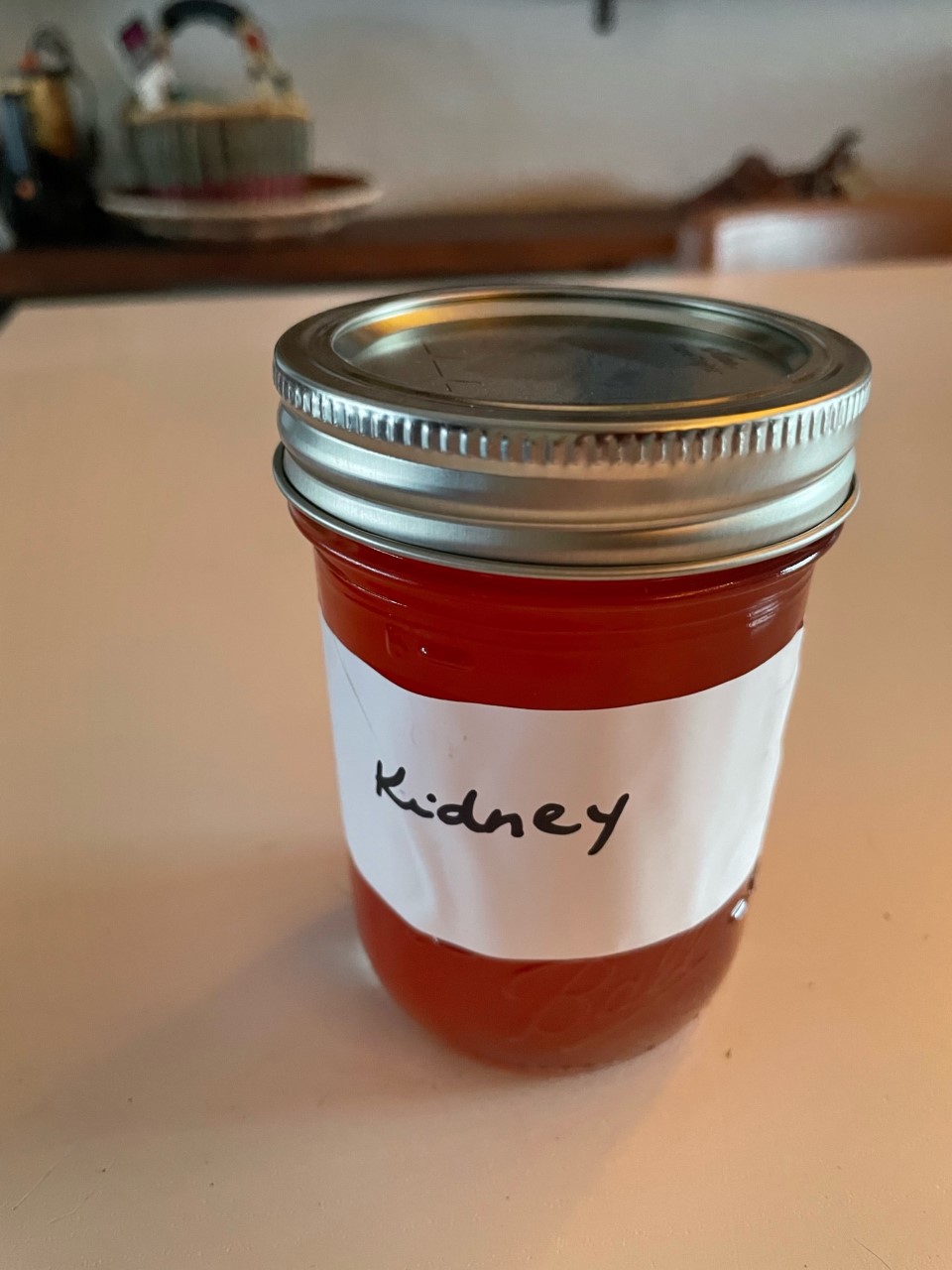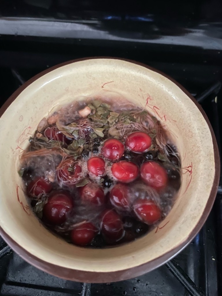 In a small pot, I combined 4 parts (I did 4 Tablespoons) frozen cranberries to two parts (I did 2 Tablespoons) each, cornsilk, juniper berries, urva ursi, and cat’s claw. I put roughly four times the water and set it to simmer, adding water as needed to make a strong tea. I decocted (boiled) this for about 30 minutes. Let cool then strain into jar. Then top with alcohol you have on hand. Doug wasn’t drinking his rum, so rather than use my delicious bourbon, I cut the decoction 50/50 with rum. (Sorry, babe.)