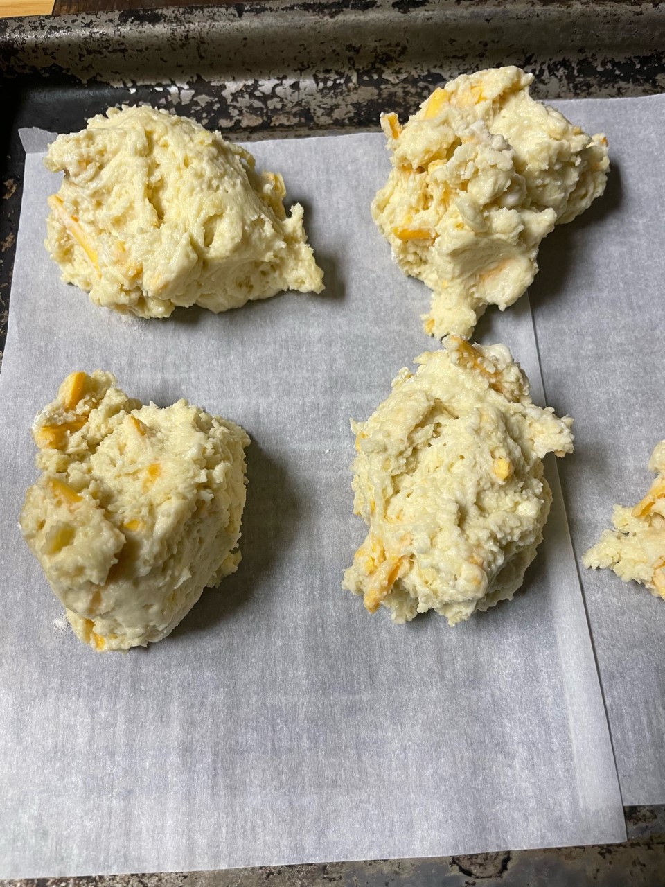 Drop by large spoonfuls on a baking sheet. I like to line mine with parchment and I bake them in the toaster oven at 425 degrees for 12 minutes.