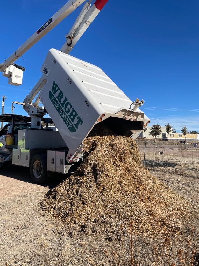 We are on a mission to transform the soil on this barren, windswept, high desert, rocky land into something that teems with life and health. We average 22 inches of moisture a year and we are on city water. Wood chips are a big part of regenerating the soil. We use them to mulch everything. It keeps the soil damp 24 hours longer than without, breaks down and creates a more diverse soil structure, promotes microorganisms, and looks nice.