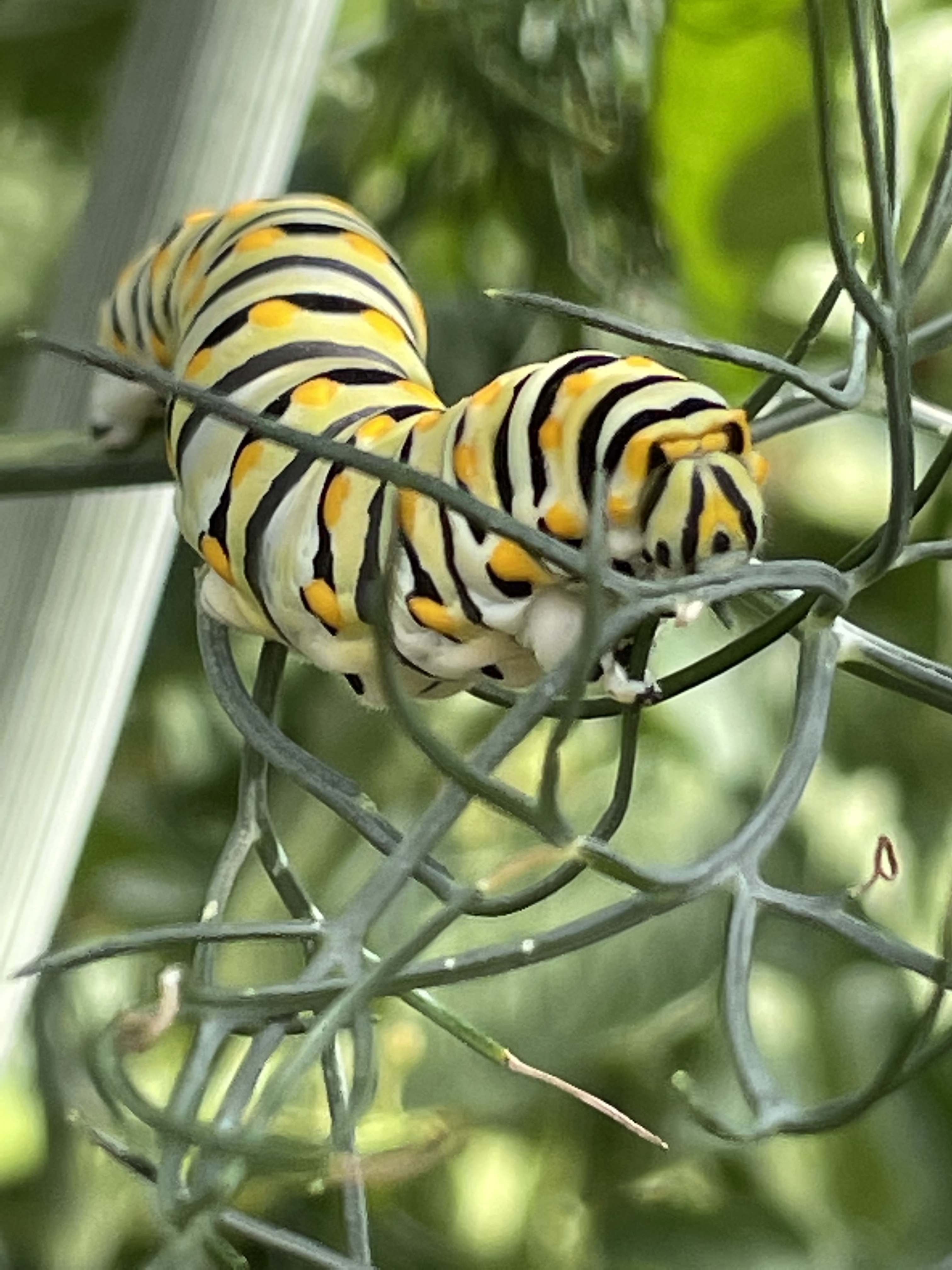 This fellow is a black swallowtail butterfly caterpillar. He loves dill and I always grow some for them. Look how amazing he is!