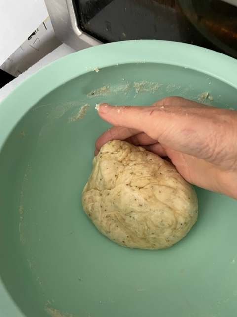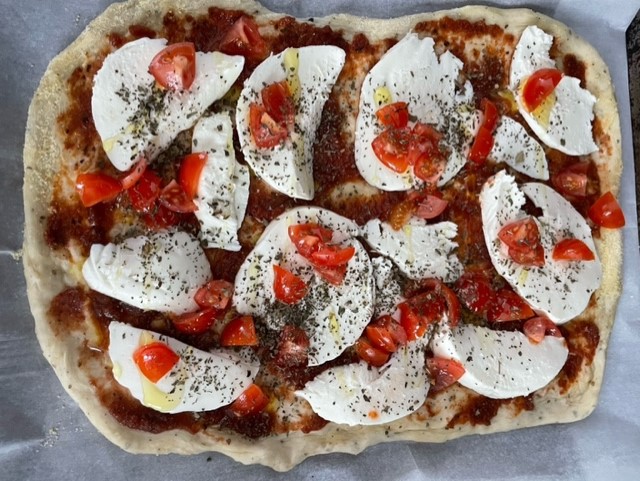- Optional: change the oil to a flavored oil. I used green chili oil in this particular pizza mixed with olive oil. Add 1 teaspoon of dried basil or oregano to the dough. Add a bit of pepper or parmesan.