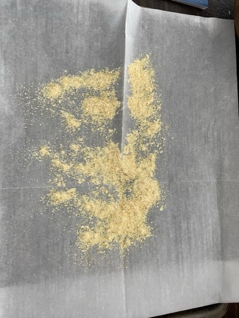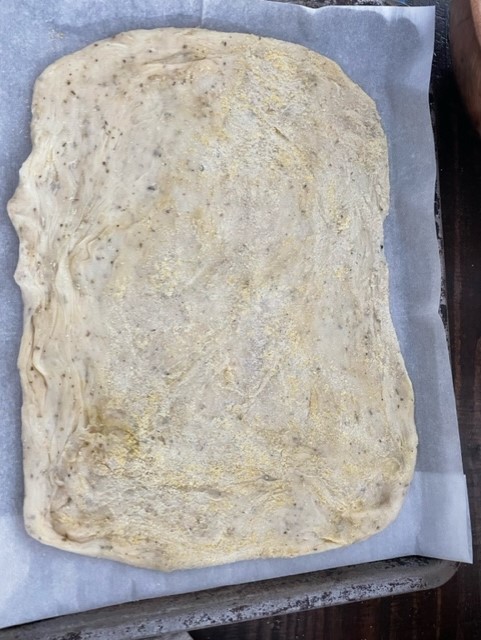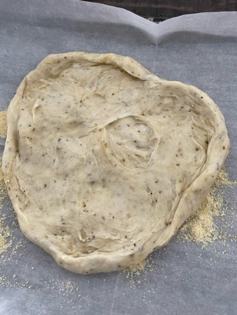 After ten minutes, pour a little corn meal on a parchment covered (optional) cookie sheet. Stretch the dough out with your fingers, then stretch it on the cookie sheet. Flip over and stretch the rest of the way.