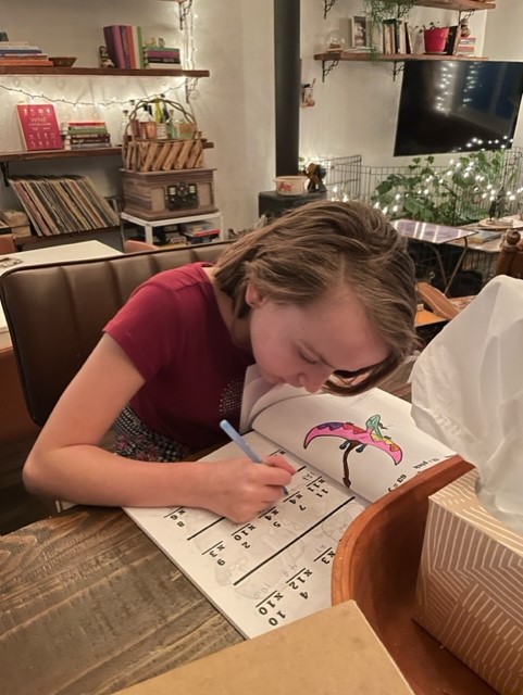 Maryjane is reading books beyond her age group, loving and devouring reading. which was my goal. When I began this journey with her, my fear was that she would not love literature. Books have formed me, made me who I am, instilled passions and wisdom in my life, and I am in love with literature. I am a strong sight reader and a writer. I had to get over my fear of loss for her in order to help her. My goal as her teacher was to make her a lover of books. To know the joy of escape into a book, and to utilize books for knowledge and inspiration. As she hovers over her art journal drawing whilst listening to her vampire/werewolf sage, I feel proud that we have succeeded at that.