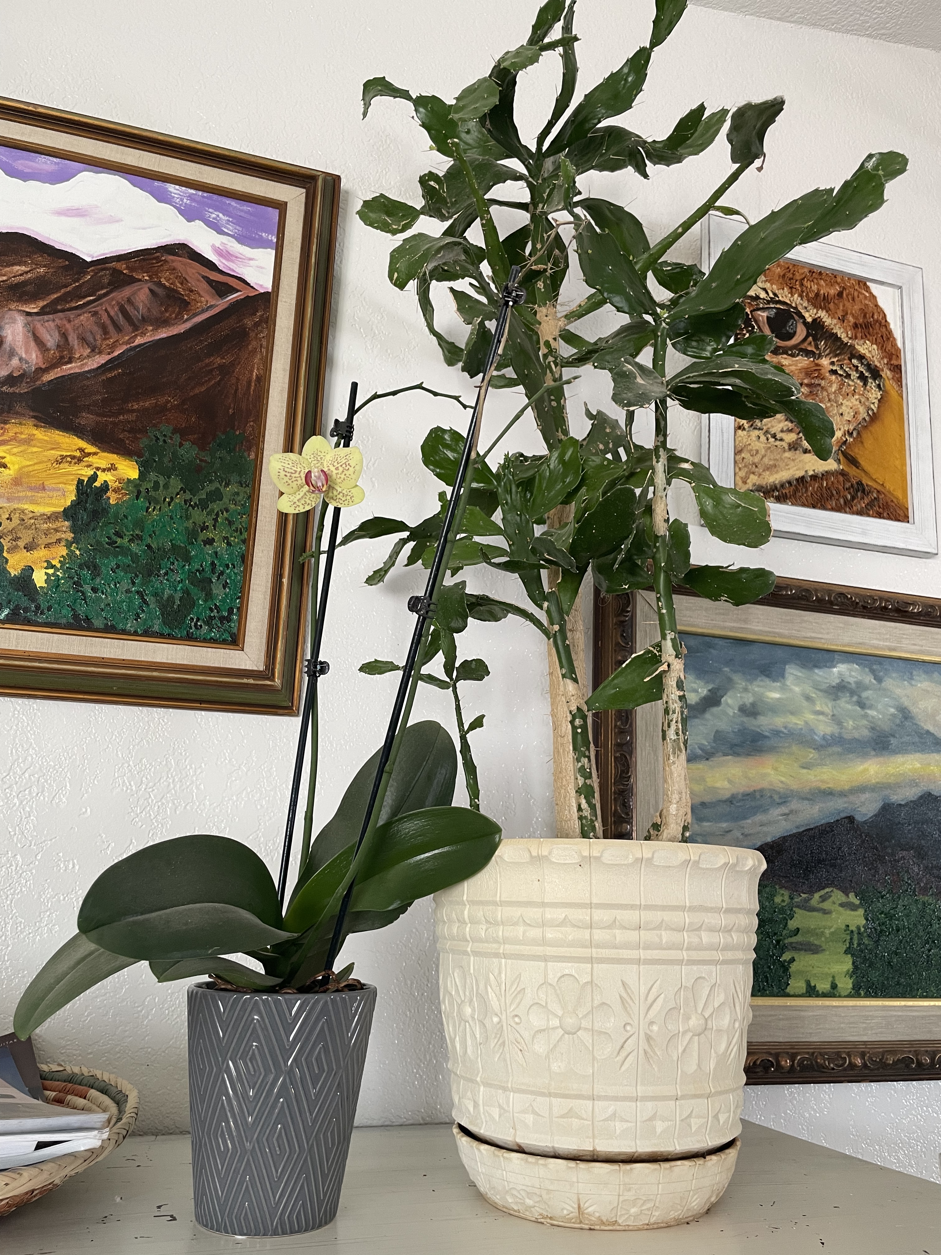 And yet, I still gratefully collect many species of plants. There is the lovely, tall cactus, sharp as a tack, proudly sitting on top of my piano (so that we do not accidentally touch it!). Lots of plants that were given to me as gifts, succulents and orchids. I have my late grandmother’s African violet, a three foot tall bamboo who started in a teensy pot. Ginger, and fabulous aloes. Fig trees and exotic Queen of the Night and Mostera. Ten year old geraniums. Memories and oxygen around every bend. Flowing pothos and philodendron. Jade and Pencil Cactus. They are all so lovely and are great troopers considering the conditions I force them to live in.