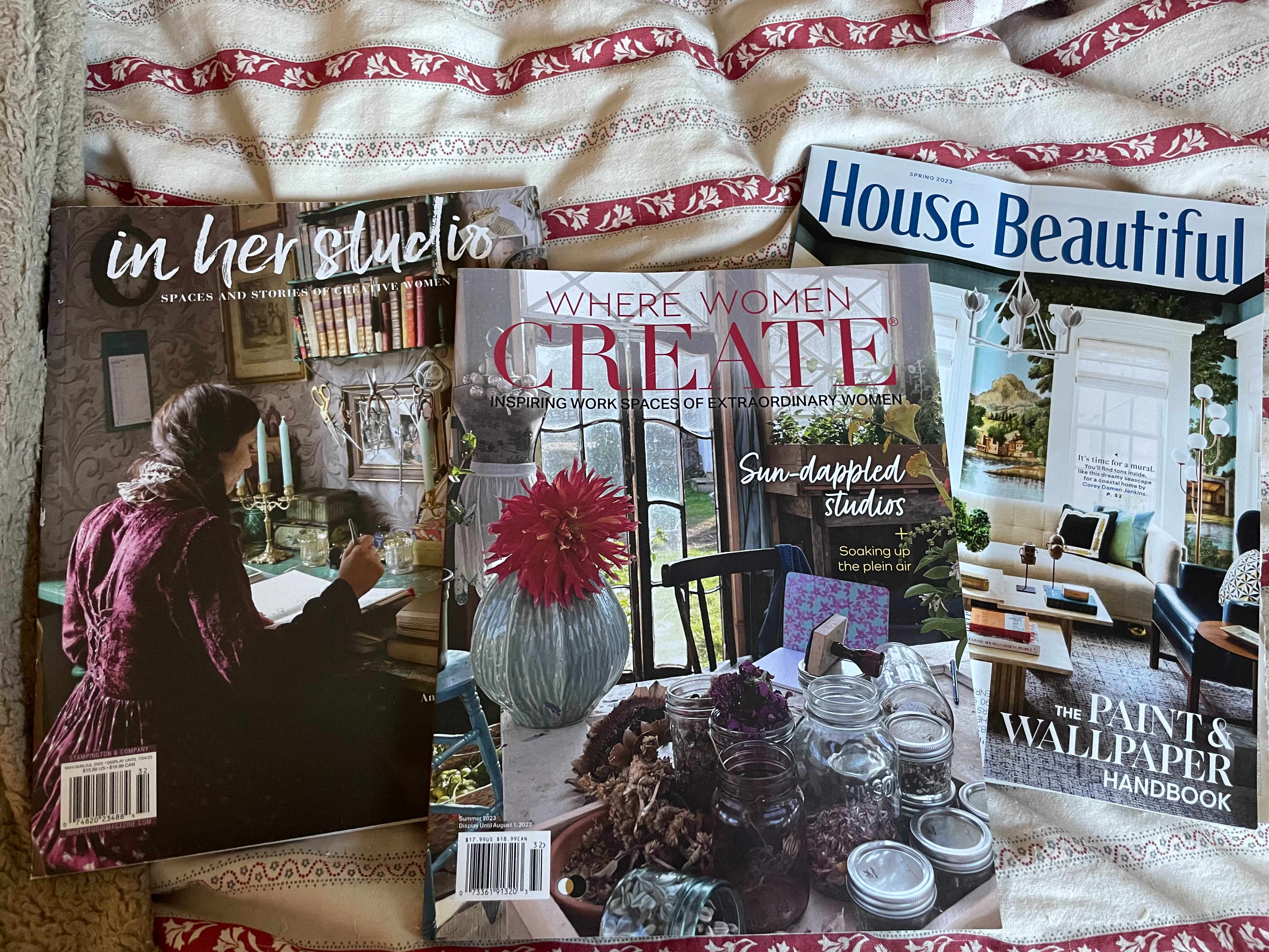 Summertime is so busy with activity and being outside every last minute of daylight leaves me too tired to read before bed at times. I love magazines all year round, but especially during the summer. I can flip through a few pages, read a few articles, get inspired, and be on my way again! In Her Studio, Where Women Create, What Women Create, House Beautiful, Country Living, Southern Living, and so many others arrive in my mailbox regularly. I love a great magazine.