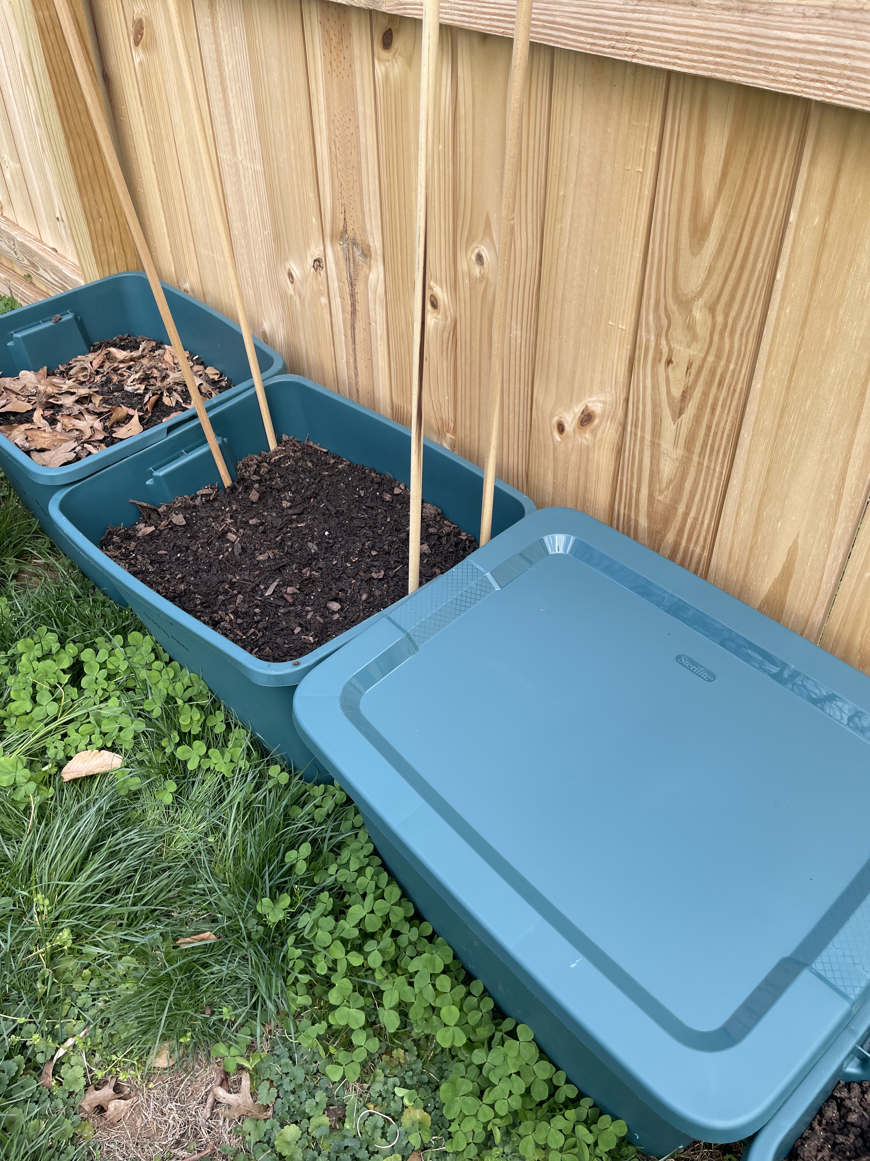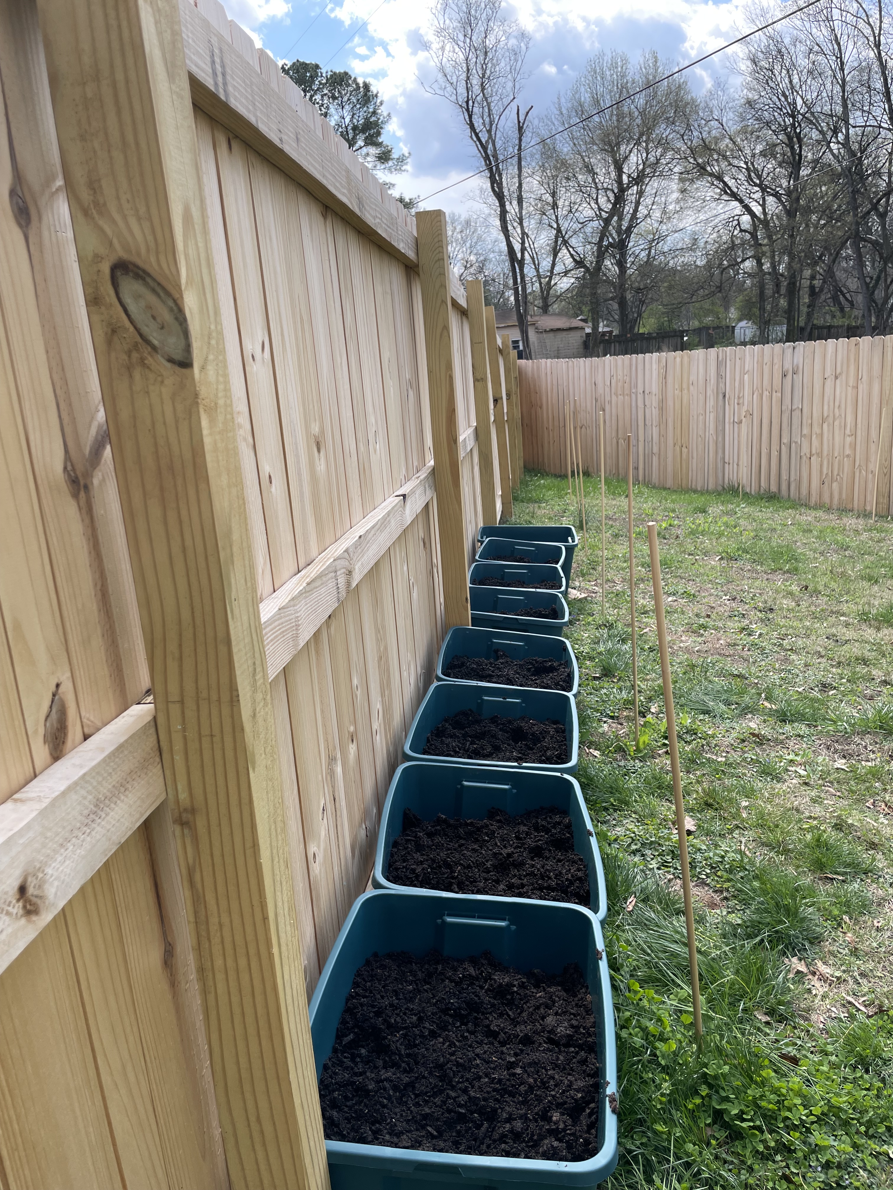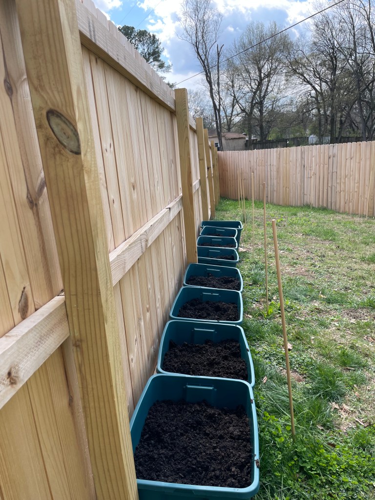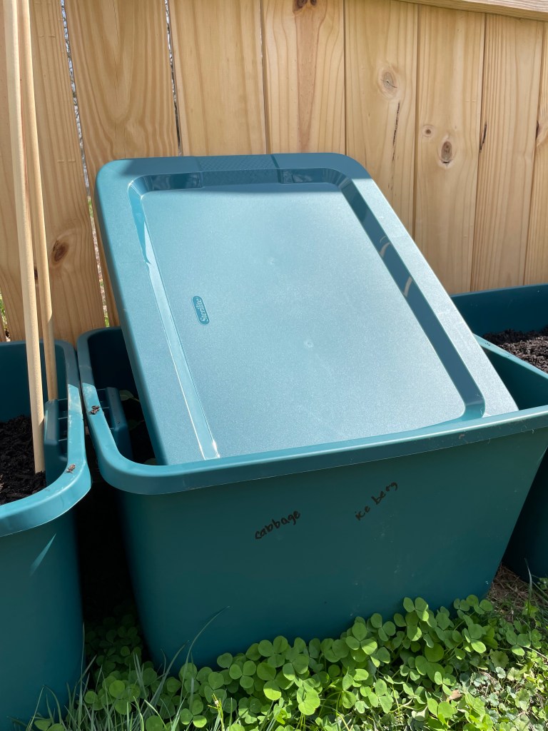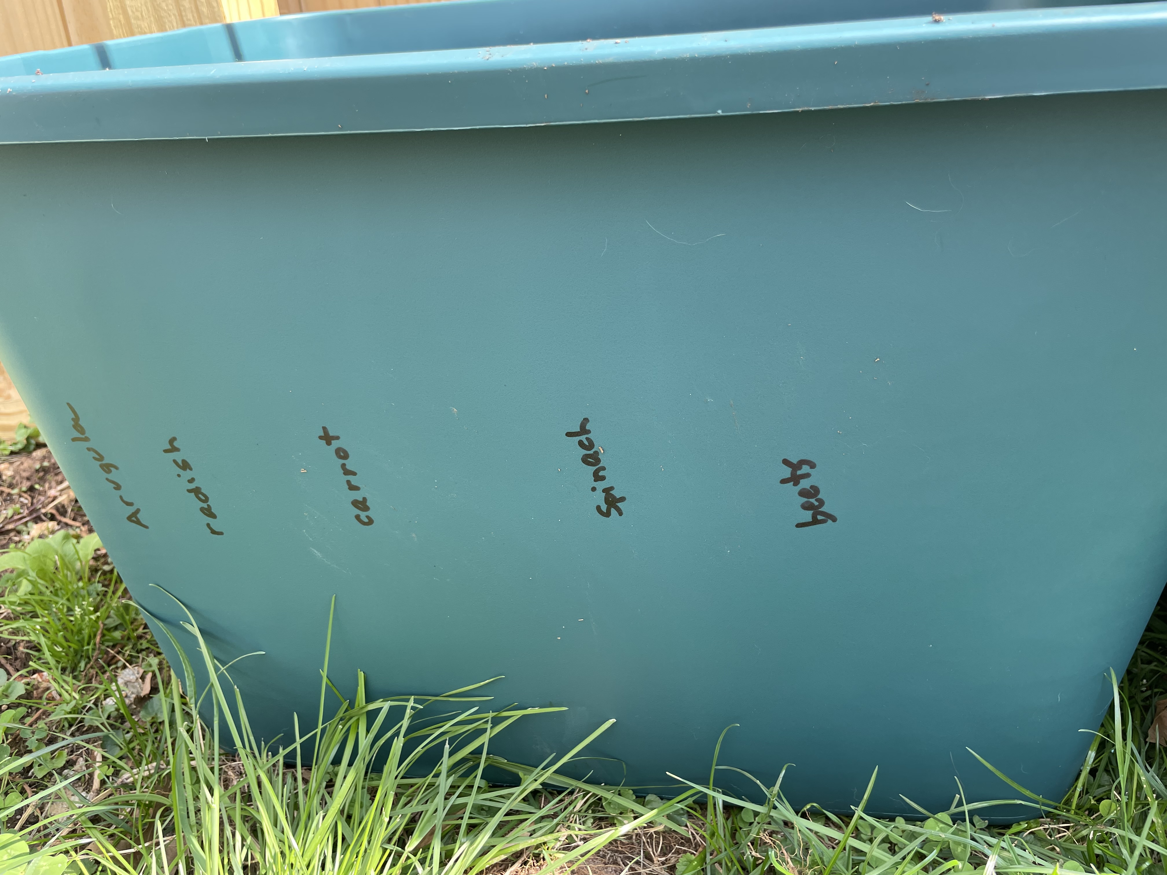 I filled the bins with half top soil and half organic gardening soil and watered. I planted my spring crops and labeled the bins with the contents. I think painting them would be great fun too!