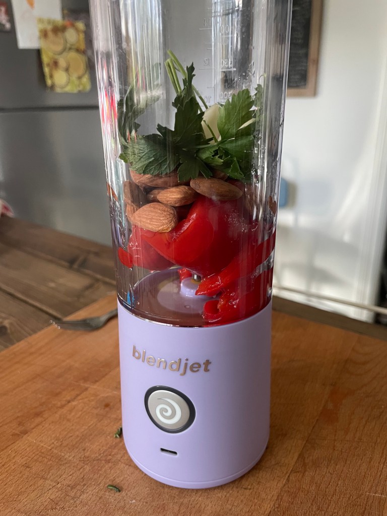 Just put a roasted red pepper, 2 cloves of garlic, a half a handful of almonds, a bunch of parsley, salt, pepper, and a good dash of red wine vinegar with a bit of olive oil and blend it up.
