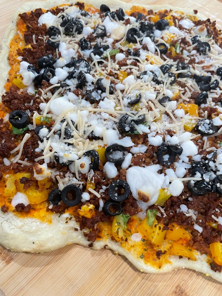 Mmm, y’all, I made the best pizza the other night. Blew my own damn mind! I topped it with fresh arugula from my garden (yay, gardening in the south!) and some good fig balsamic vinegar. It was piled high with Gardein veggie ground “meat” that I had sautéed up with some yellow peppers, and I added lots of paprika, smoked salt, pepper, and fennel to make a sausage-like flavor. Don’t be afraid of that spice cupboard. Then added vegan feta and parmesan. The base of my pizza was Kite Hill chive cream cheese topped with a homemade romesco sauce that comes together so easy.