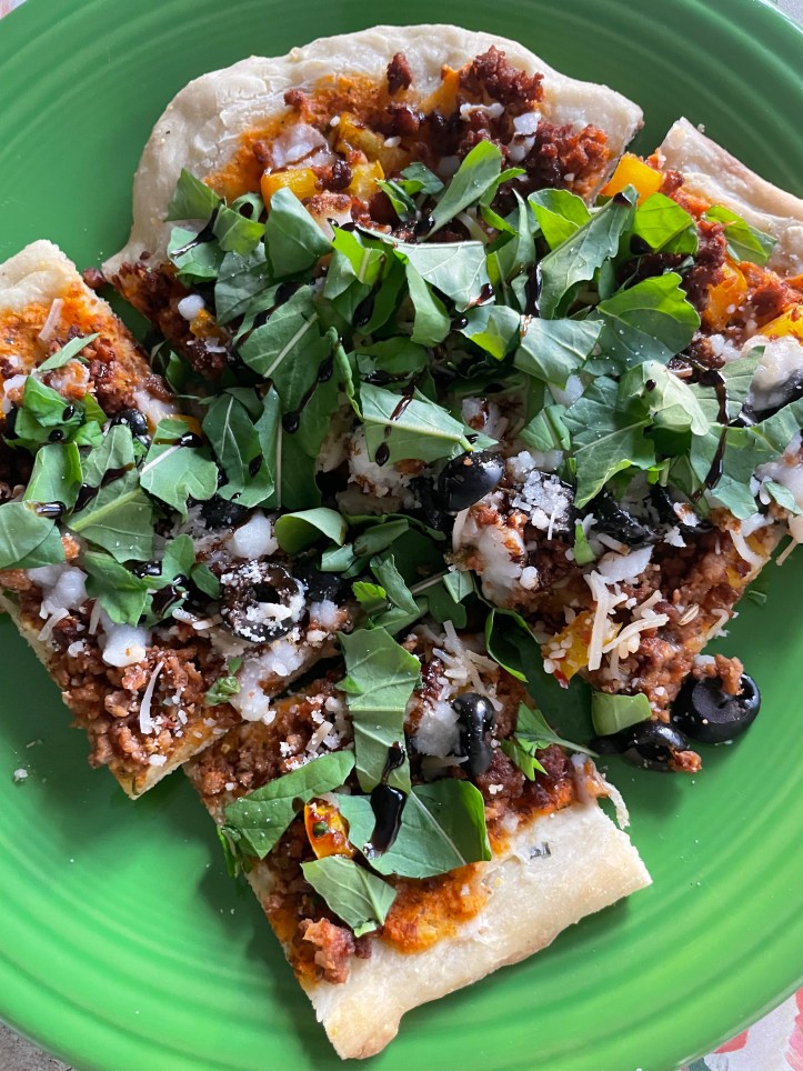 So, now we have a homemade pizza crust, cream cheese, tangy romesco, peppers and “sausage”, feta, parmesan, and when it comes out of the oven add arugula, and balsamic. Dang. It’s a good time to be vegan.