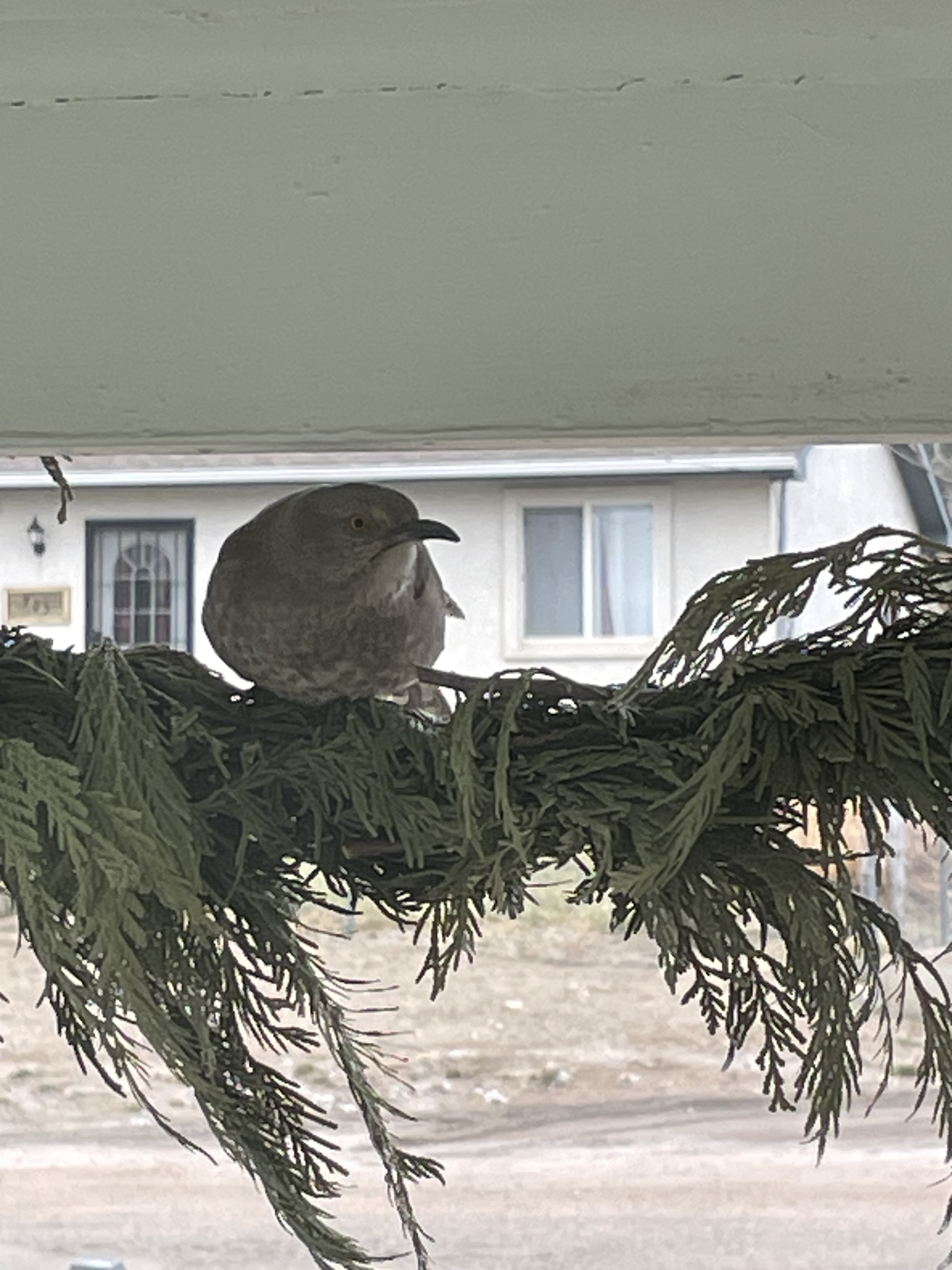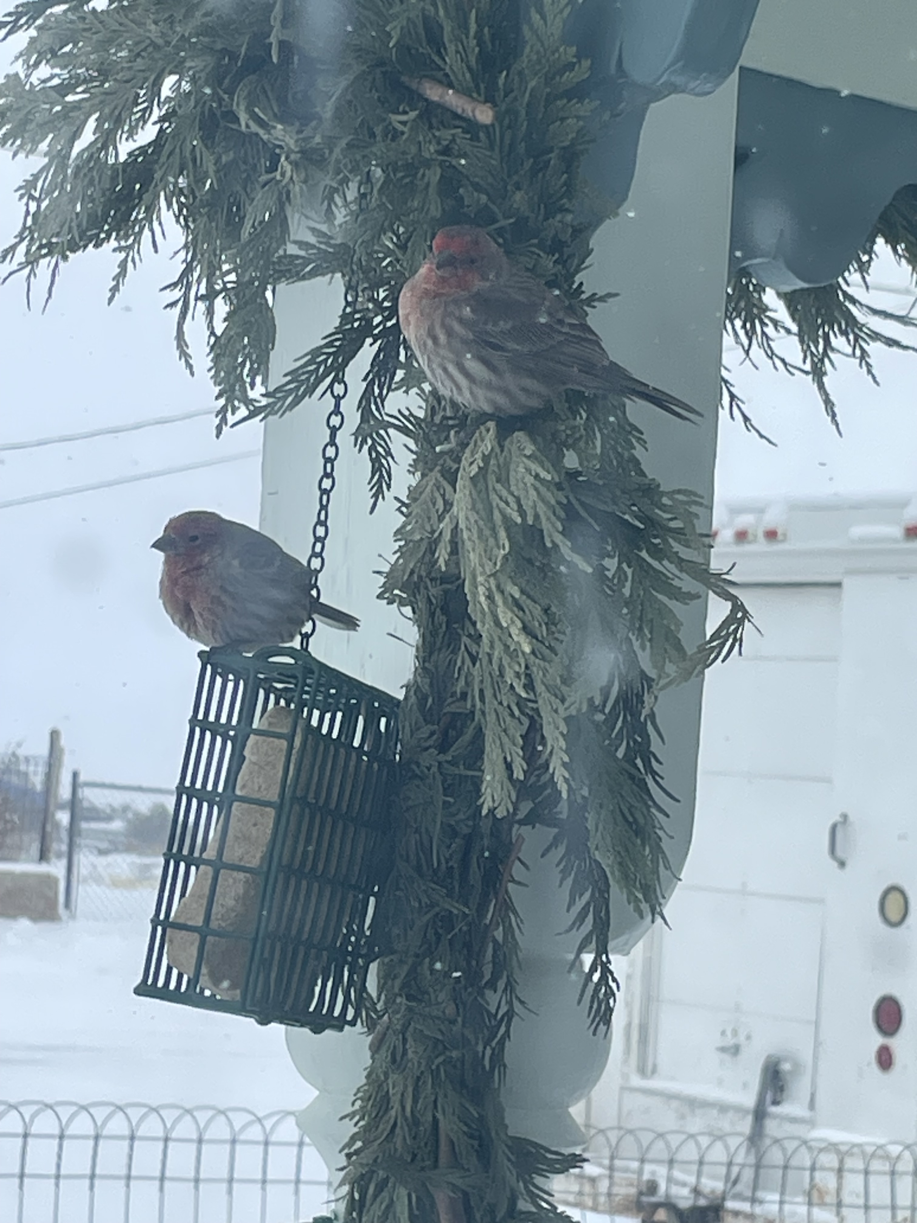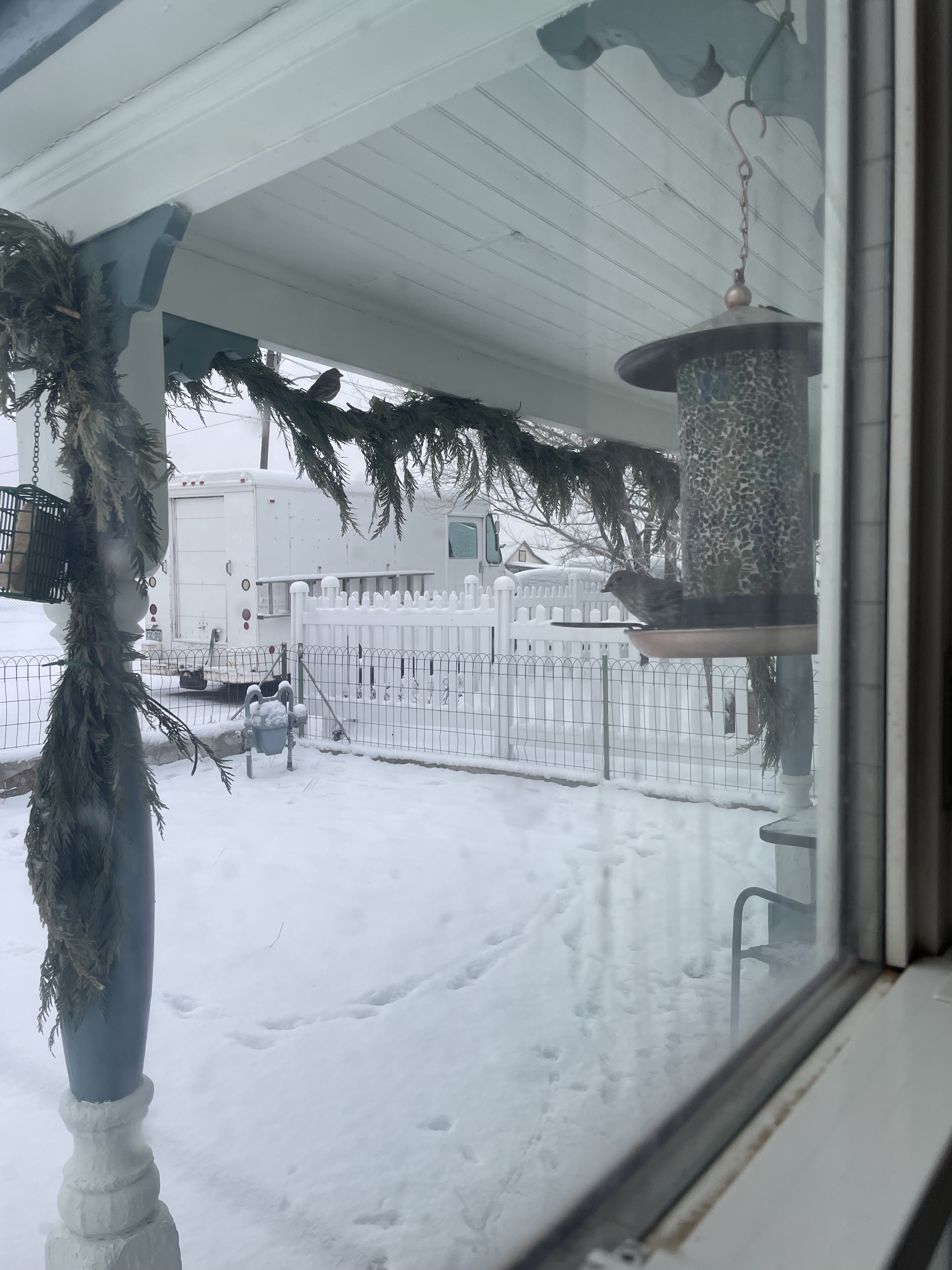 We put our Christmas tree outside on its side near the porch and it is filled with birds finding shelter and taking a rest. The garland on the front porch also serves as a place for the birds to sit and have meetings. It will come down soon now that (in my mind) it’s spring, but I will find a garland of lights to replace it.