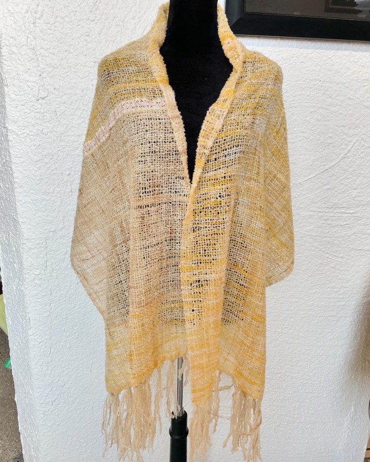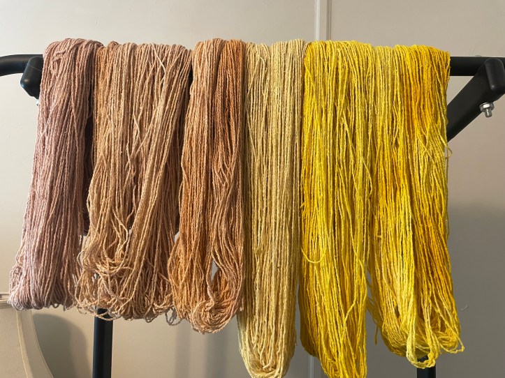 I currently upcycle most of my yarn to keep it out of landfills. I obtained several skeins of a beautiful wool/silk blend and began experimenting with different fruits and vegetables to make dyes. I really love how the purple cabbage turned out. The beets and avocado pits were not as pink as I wanted. The red chile could have sat longer. But turmeric…wow! It is a showstopper in no time.