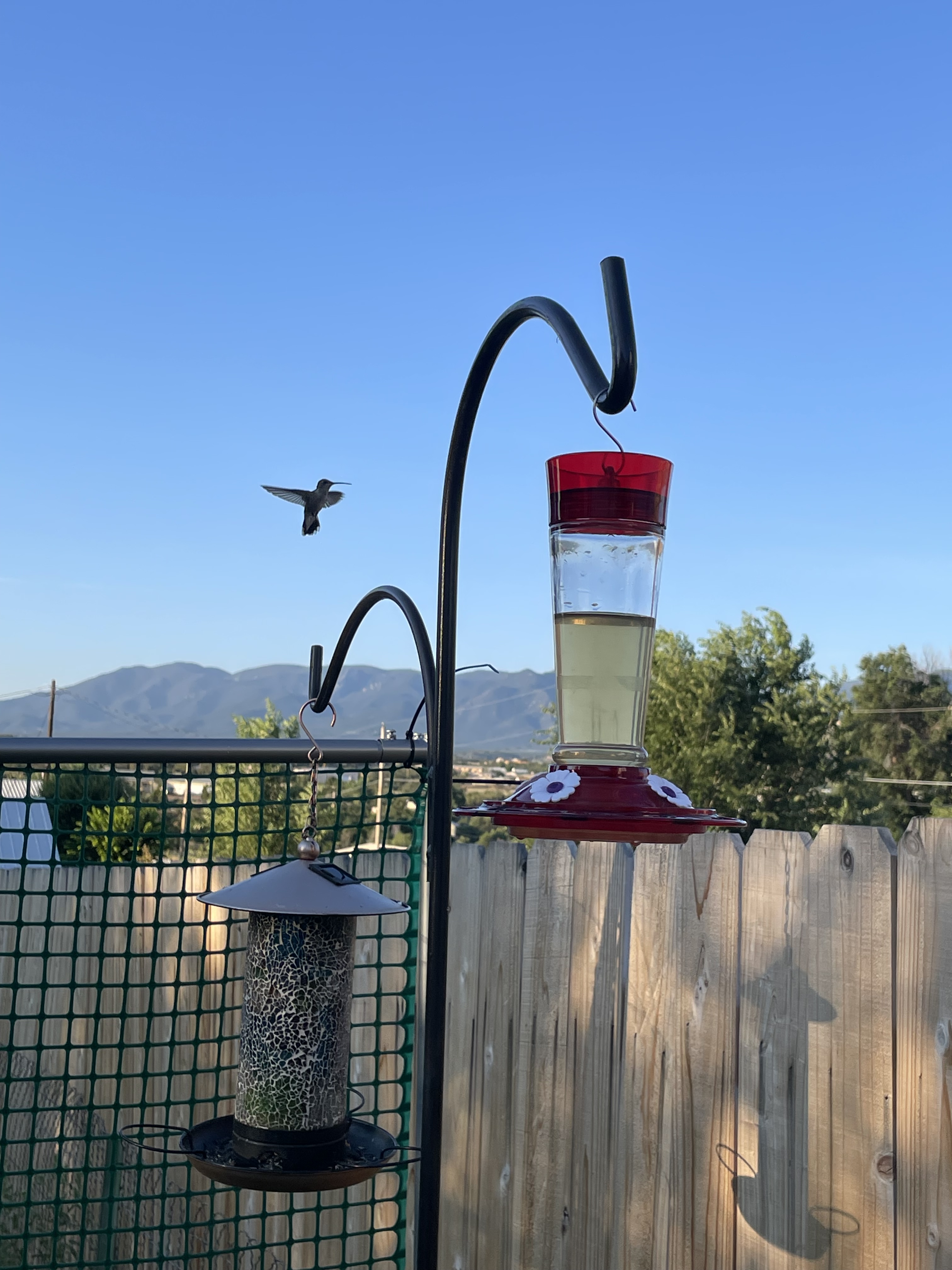 What eats grasshoppers? Birds are one. My daughter has a beautiful garden in the middle of ten acres in Kiowa. She has little issues with grasshoppers. They leave the prairie grass long so the insects typically stay out there. Last year, her husband mowed too soon and the grasshoppers descended upon the house and her gardens. This year, they are leaving them in the field! She has several bird feeders around her gardens and lots of birds. I have bird feeders in the front gardens, but wanted more in the back. We bought a shepherd’s hook and placed a feeder and a hummingbird feeder there. Even if you don’t have a grasshopper issue, birds are an important part of a healthy ecosystem and add to the joy of being outdoors.