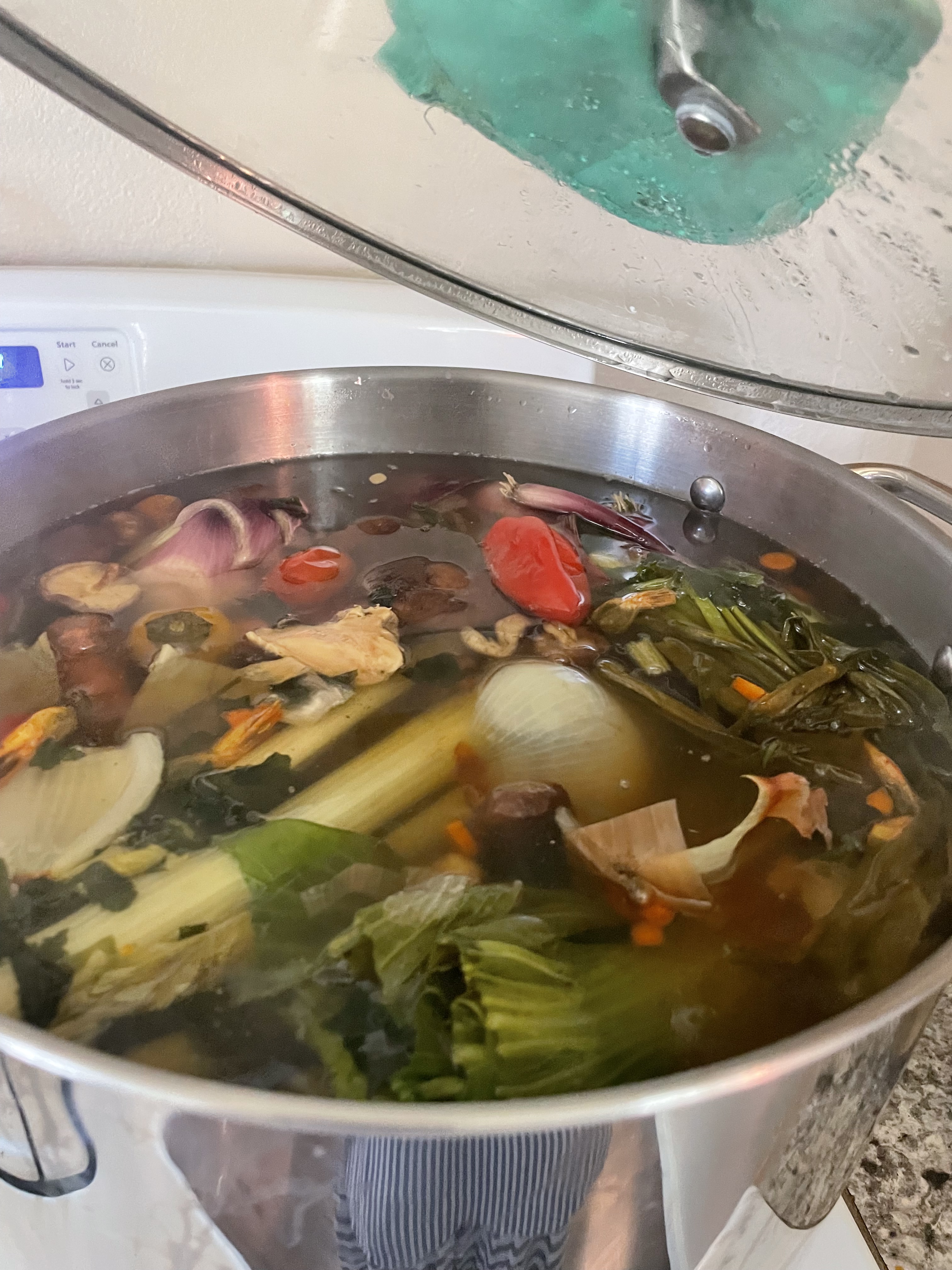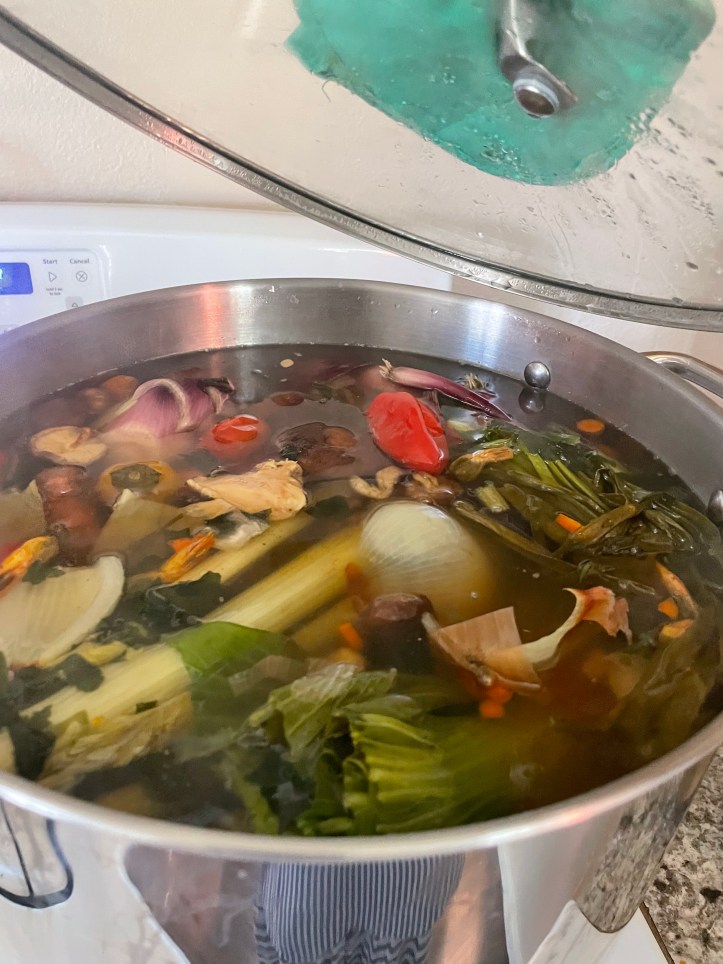 I came inside and put my apron on. I piled vegetables into my big pot, carrots, celery, onions, mushrooms, leftover tidbits of veggies that I had frozen, garlic, and filled the pot with clean water. I let that simmer for hours while I prepared the green beans.