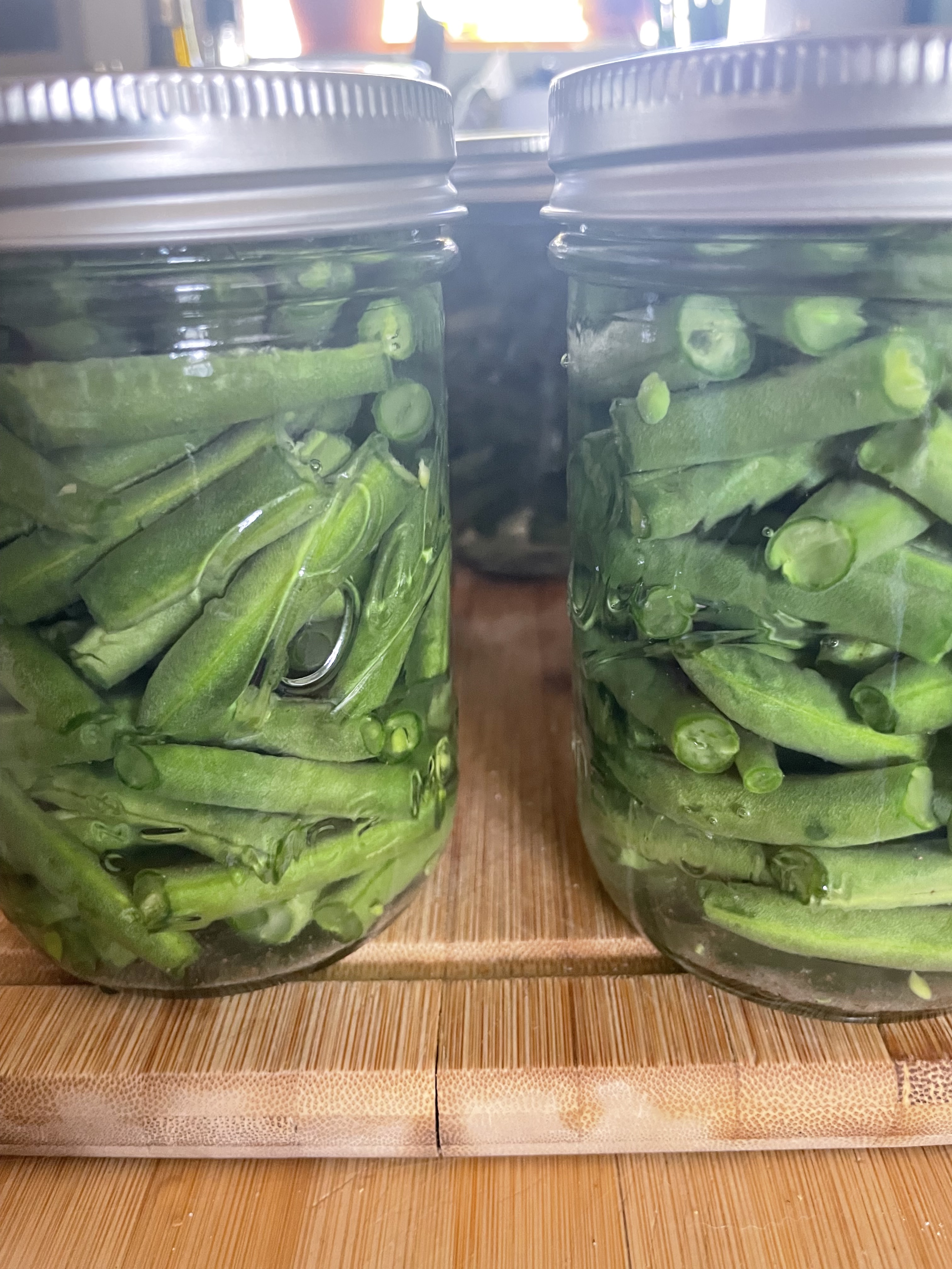 To prepare green beans for canning, simply snip off the very ends of each bean and with scissors cut them into 1-2 inch pieces. It’s quite nice with a cup of tea and a bowl in your lap. While I worked, I told Annie stories about Thompson and stories of my own and we had lovely conversation. It was a perfect day.