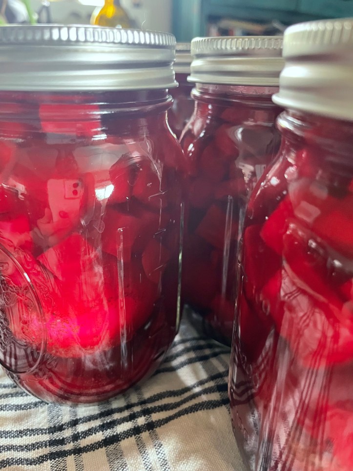This week I canned pickled eggs and beets (believe me, it’s amazing), get recipe here. I will never forget that dusky summer evening out in the country at our late friend’s house. We sat laughing at the ducks running by with the chickens. Nancy brought out a platter of pickled eggs and a bottle of wine. We were wary of the sunset looking eggs, beautiful in their swirls of orange and purple, dyed from the beets, but after one bite, she had to go in and get a second jar! Delicious.