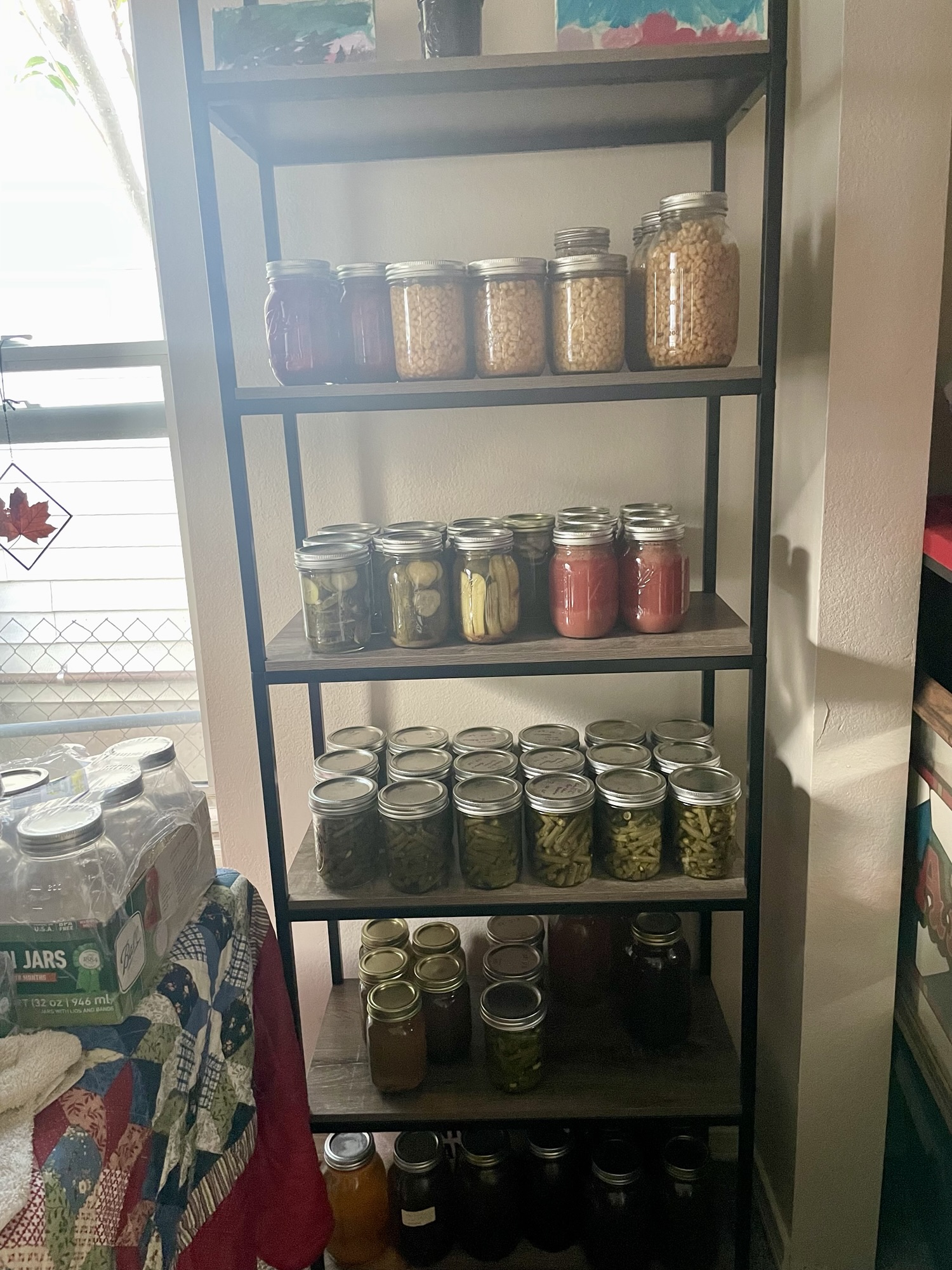 My home grocery store is filling up with lots of canned goods for winter. Bright green beans and sunny corn, spicy salsa, and dandelion jelly. Lots of delicious broth and more fill the shelves. Not bad for my first year on this homestead. My daughter, husband, and I take the hour drive east to an organic farm on the Mesa to buy fresh produce if our gardens don’t do well any given year. Both of my daughter’s gardens are doing well in their third years. I am just building the soil and creating a biodiverse environment.