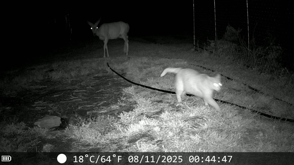 I could not wait to get our wildlife camera set up in the back yard to see what goes on back there while I am sleeping. Of course, Nubs the magical buck comes by each night, usually at dusk and hangs out near me. Last night was particularly exciting with the appearance of a fox, raccoon, deer, and the neighbor’s cat.