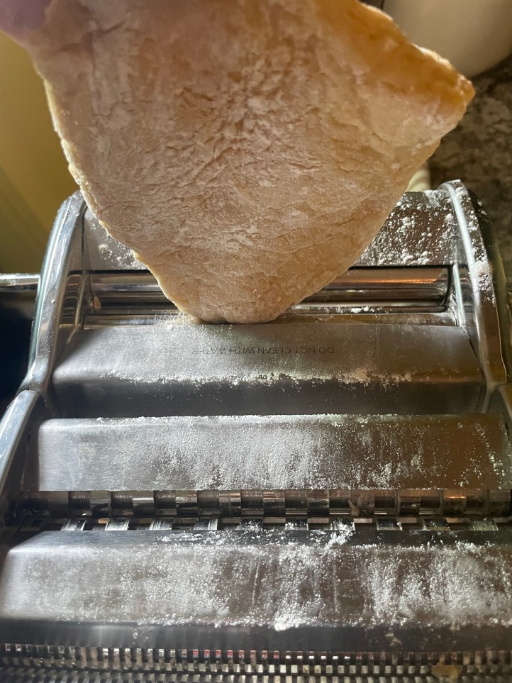 Split into 4 pieces. Take one piece and flatten it with your hands. Put through the pasta sheet portion of pasta maker with the knob set at 7. Repeat with knob set at 4. Then 2. As it comes through, dust with flour, cut in half if needed. Then put through fettuccine part set at 2. Dust with flour as you go so the noodles are not sticky. (I said easy, but I didn’t say it wasn’t messy!)