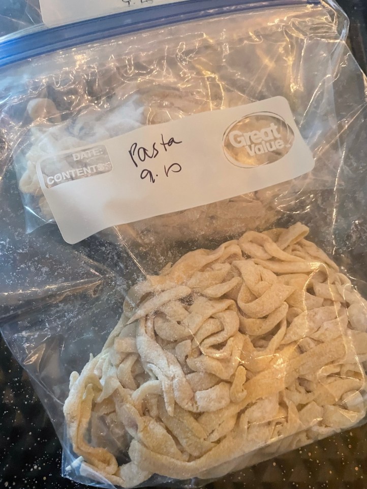 Repeat with other three sections. This serves about eight people so I like to freeze the pasta in portions, roughly a handful per person. Homemade pasta is more filling than regular pasta and has a satisfying bite to it.