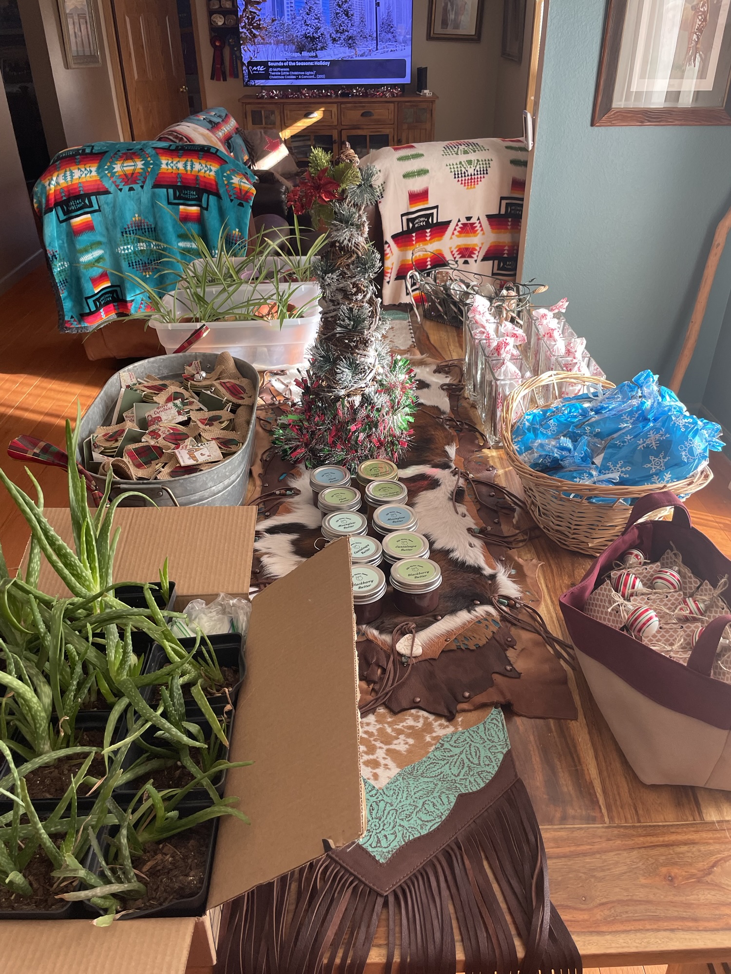 The gifts ranged from homemade candles, to hand etched vases, baked goods, plants, jams, and hair clips. I brought ten pots of baby aloes. Each woman walked around the table gathering one of each item. Smiles and laughter filled the room.