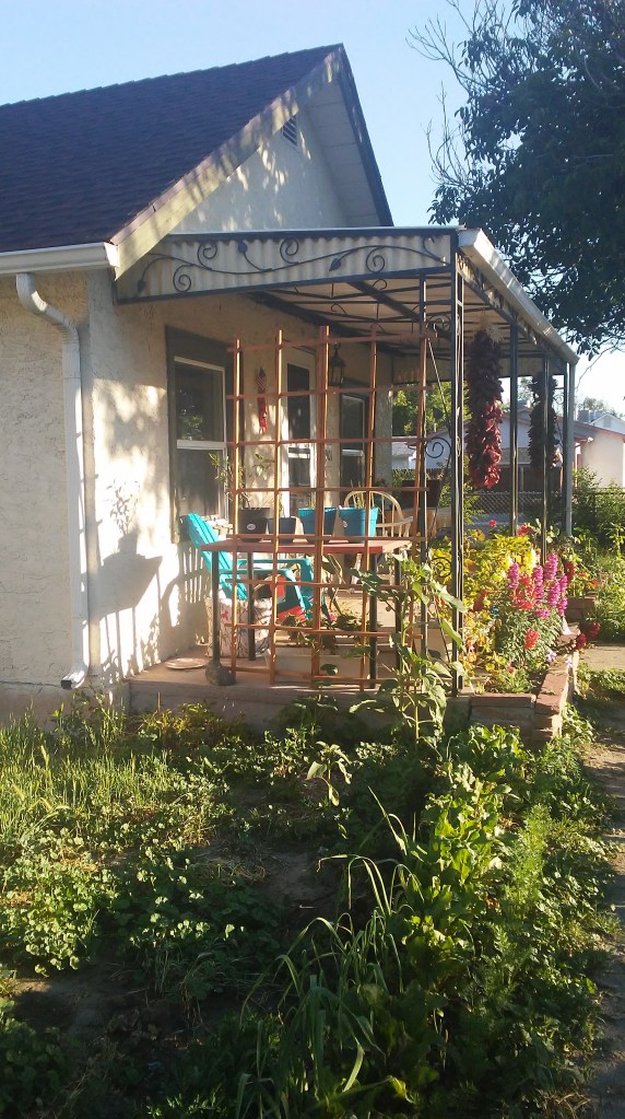 To Pueblo with our solar power (still hooked up to the grid, however. That is the law in most of Colorado.), wood stove, canned goods, and fresh eggs. The clothes line went away when we adopted an adorable fluff ball puppy. Our Great Pyrenees, Gandalf, loved to swipe the clothes from the clothes line and gleefully destroy them in the yard. A stackable washer and dryer took its place.