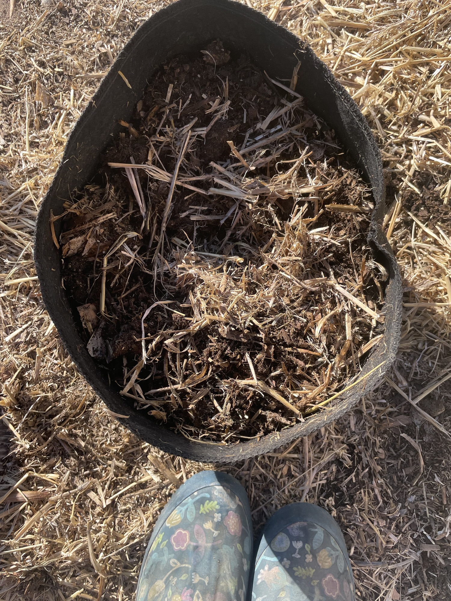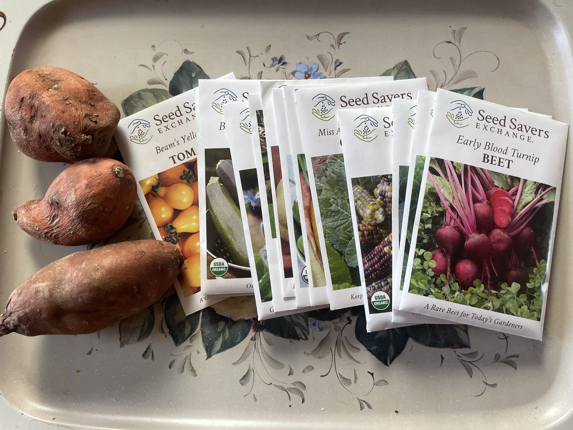 What I do have to plant this week is sweet potatoes. Sweet potatoes take a long time to grow, so I start them in a pot of soil and keep them in a sunny room to grow. By May, they will (hopefully) have many vines that are snipped with the piece of sweet potato they are growing from, and then planted. I always buy organic produce so I know that I can plant whatever I buy. Around this time, when I notice potatoes and sweet potatoes starting to shrivel or grow eyes, I put them in the back of my refrigerator. That slows their growth until I can plant them.